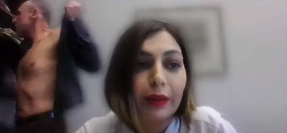 Η Μαρία Απατζίδη δεν έδωσε σημασία όταν αρχικά μπήκε στο πλάνο της ο Κλέων Γρηγοριάδης, έριχνε απλά κλεφτές ματιές προς τα πίσω. Συνέχισε την παρέμβασή της κανονικά και προσπαθώντας να συνεχίσει την ομιλία της δεν είδε ότι ο Κλέων Γρηγοριάδης ξεκούμπωνε το πουκάμισό του, μέχρι που… το έβγαλε!