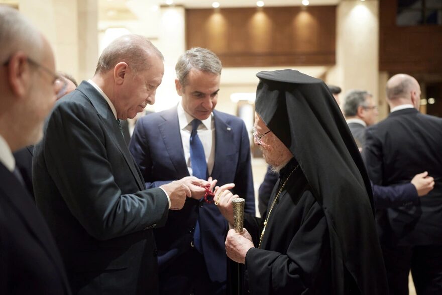 Στο περιθώριο του δείπνου ο Ταγίπ Ερντογάν, ο Κυριάκος Μητσοτάκης και ο Οικουμενικός Πατριάρχης Βαρθολομαίος. Ο Έλληνας πρωθυπουργός έδειξε στον κ. Βαρθολομαίο το κομπολόι του, ένα κόκκινο από κεχριμπάρι, ενώ ο Πατριάρχης το δικό του, με χρυσές χάντρες με τον Τούρκο πρόεδρο να επιδεικνύει ιδιαίτερο ενδιαφέρον, δεδομένου ότι και στην Τουρκία το κομπολόι αποτελεί αγαπημένο αξεσουάρ.