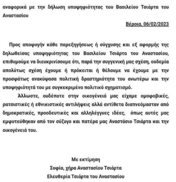 Στη δήλωσή τους η μητέρα του Βασίλη Τσιάρτα, Σοφία, και η αδερφή του, Ελευθερία, δηλώνουν ξεκάθαρα ότι «ουδεμία απολύτως σχέση έχουμε ή πρόκειται ή θέλουμε να έχουμε με την προσφάτως ανακύψασα πολιτική δραστηριότητα του ανωτέρω (σ.σ. του Τσιάρτα) και την υποψηφιότητά του με συγκεκριμένο πολιτικό σχηματισμό».