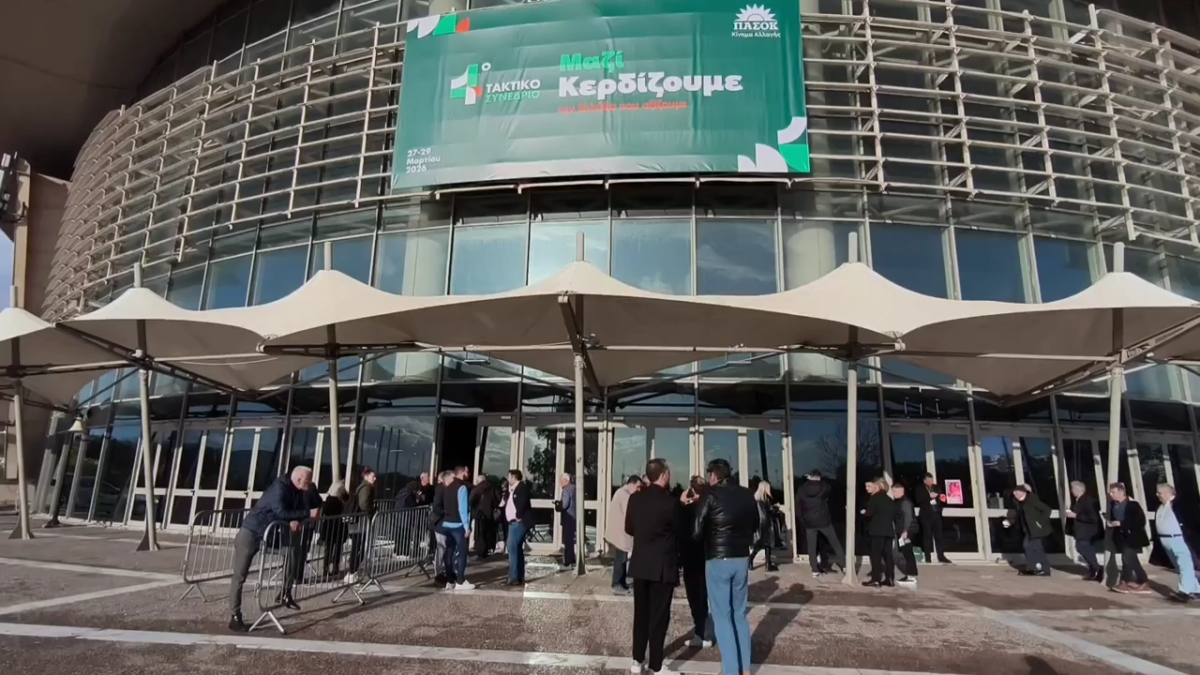 Οι εκλεγμένοι σύνεδροι προσέρχονται στην είσοδο για να παραλάβουν τις διαπιστεύσεις τους, με αποτέλεσμα να παρατηρείται πρόσκαιρος συνωστισμός λόγω της αυξημένης προσέλευσης και των απαραίτητων ελέγχων ασφαλείας πριν από την είσοδο στον χώρο. Σε κάθε θέση που έχει τοποθετηθεί η σημαία του ΠΑΣΟΚ, καθώς και ερωτηματολόγιο σχετικά με τις πολιτικές προτεραιότητες που καλείται να θέσει το κόμμα, με βάση τα σημαντικότερα ζητήματα όπως τα αντιλαμβάνονται οι συμμετέχοντες.