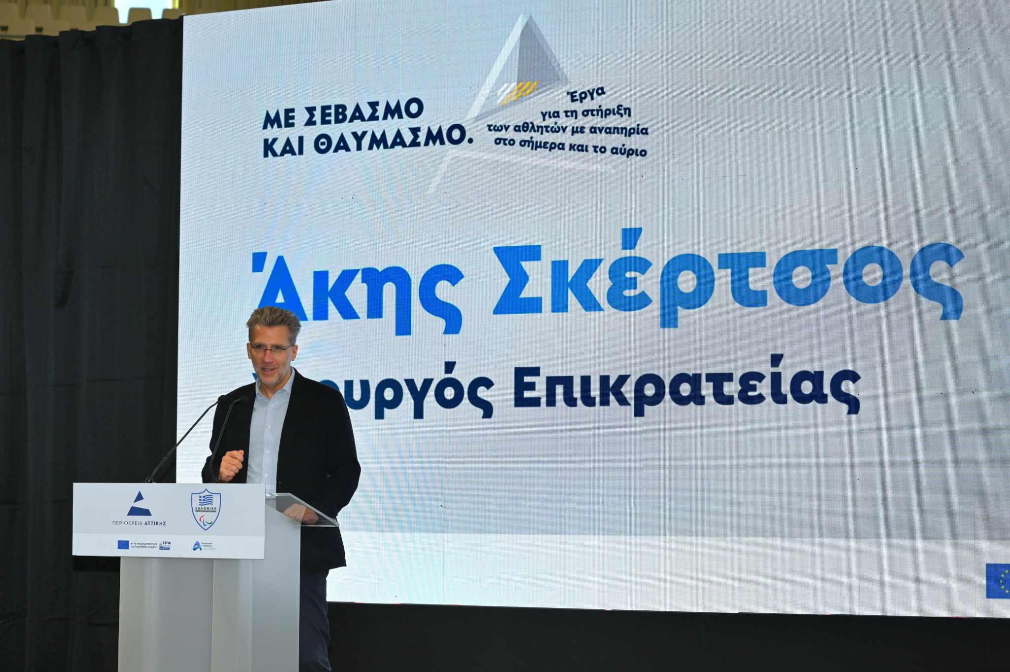 Από την πλευρά του ο Υπουργός Επικρατείας Άκης Σκέρτσος, εκπροσωπώντας τον Πρωθυπουργό Κυριάκο Μητσοτάκη δήλωσε ότι «πρόκειται για μια εκδήλωση από την Περιφέρεια Αττικής, ιδιαίτερου συμβολισμού και ουσίας». Επισήμανε ότι στην παρούσα περίοδο ολοκληρώνεται το τελικό κείμενο της κυβέρνησης για το «Εθνικό Στρατηγικό Σχέδιο για τα Άτομα με Αναπηρία 2024 – 2030». Και πρόσθεσε: «Πιστεύουμε σε μια Ελλάδα με όλους και για όλους, όπου κανείς δεν περισσεύει. Ξέρω ότι έχουμε μείνει πίσω και αυτό θα αλλάξει. Έχουμε και τα εργαλεία και τη βούληση και τους πόρους». Ο Υπουργός Επικρατείας αναφέρθηκε επίσης στην αύξηση της χρηματοδότησης από το κεντρικό Κράτος προς τις Περιφέρειες, τονίζοντας: «Η κυβέρνηση έχει αυξήσει τους πόρους των περιφερειακών σχεδίων, κάθε Περιφέρειας, από 50 – 60% για την τρέχουσα προγραμματική περίοδο. Αυτός είναι ο χώρος που επιτρέπει και στην Περιφέρεια Αττικής να προχωρήσει στην ένταξη και ενός τόσο σημαντικού έργου, το οποίο συμβάλλει στην προσβασιμότητα των ατόμων με αναπηρία σε σύγχρονους αθλητικούς χώρους και προωθεί την αρχή της ισότητας, της ισονομίας και της ισοπολιτείας. Θέλουμε να πετύχουμε τον στόχο της διπλής σύγκλισης: Πρώτον η Ελλάδα να ακολουθεί την Ευρώπη σε θέματα ισότιμης πρόσβασης των ΑμεΑ και δεύτερον, να μειώσουμε την απόσταση που χωρίζει τα άτομα με αναπηρία με τον υπόλοιπο πληθυσμό. Καμία απολύτως διάκριση δεν πρέπει να υπάρχει σε στοιχειώδη αγαθά και υπηρεσίες. Ως εκ τούτου, προτάσσουμε την αρχή της ίσης πρόσβασης στην αγορά εργασίας, στην εκπαίδευση, στην υγεία, στον αθλητισμό, στον πολιτισμό, στο φυσικό και ψηφιακό περιβάλλον. Βήμα – βήμα πιστεύουμε ότι μπορούμε να χτίσουμε μαζί μια Ελλάδα η οποία θα είναι πιο δίκαιη και φιλική στα άτομα με αναπηρία».