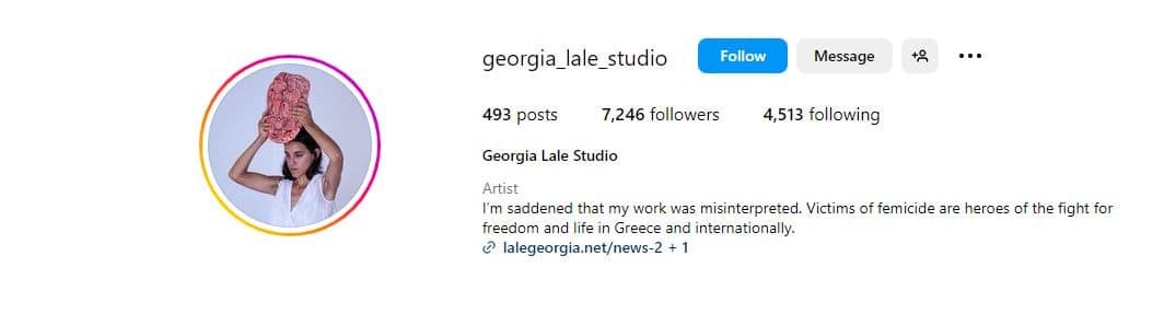 “Λυπάμαι που η δουλειά μου παρερμηνεύτηκε. Τα θύματα γυναικοκτονιών είναι ηρωίδες του αγώνα για ελευθερία και ζωή, τόσο στην Ελλάδα, όσο και διεθνώς”, αναφέρει χαρακτηριστικά στο bios της στο Instagram της. Η Γεωργία Λάλε, έχει αναδημοσιεύσει πολλά μηνύματα υποστήριξης στον επίσημο λογαριασμό της στο Instagram.