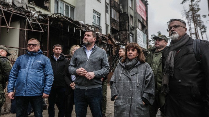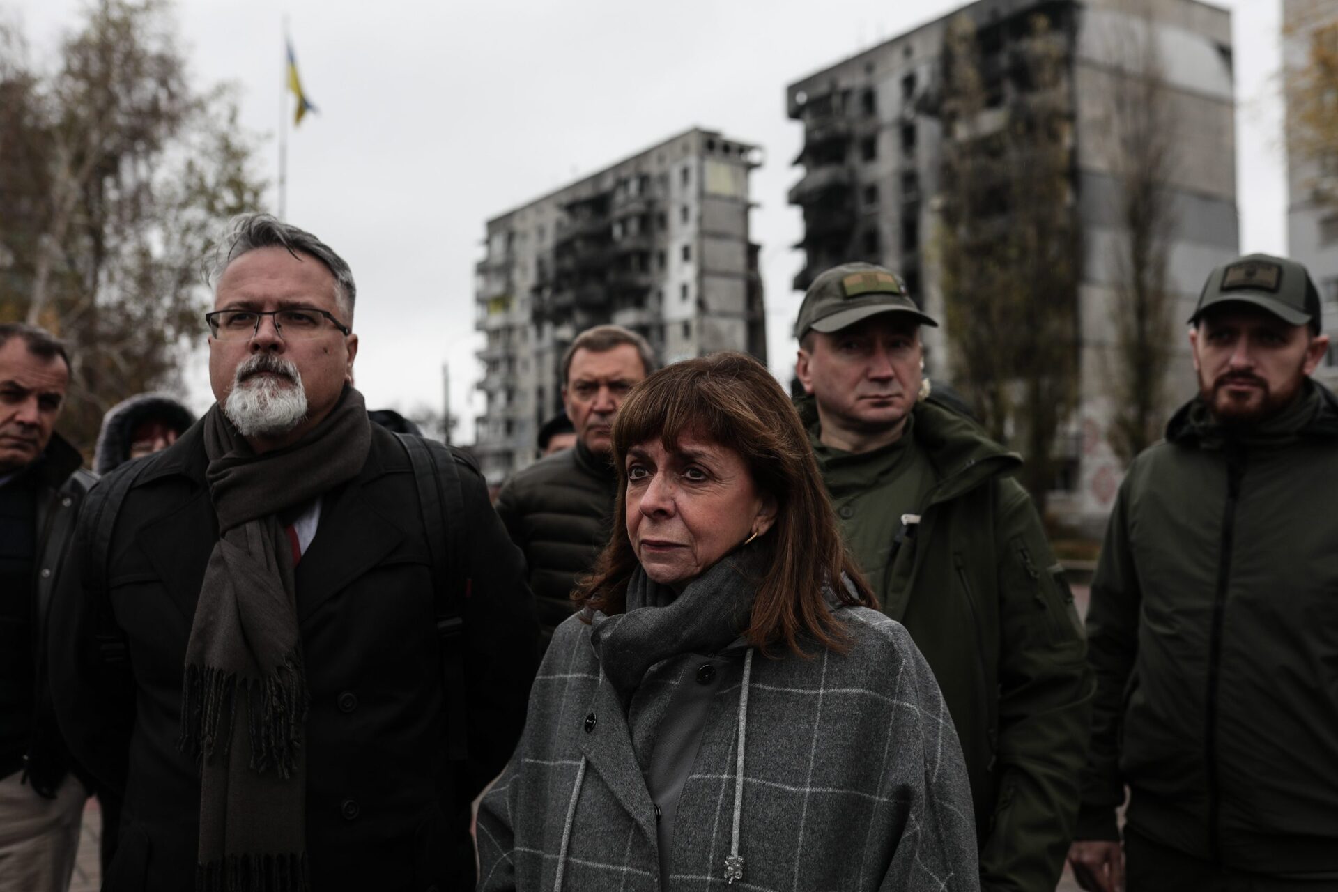 Στη Μπούτσα η κυρία Σακελλαροπούλου περιηγήθηκε στο σημείο που βρέθηκαν ομαδικοί τάφοι Ουκρανών πολιτών στον περίβολο της εκκλησίας του Αγίου Ανδρέα και είδε φωτογραφική έκθεση με αμάχους θύματα του πολέμου.