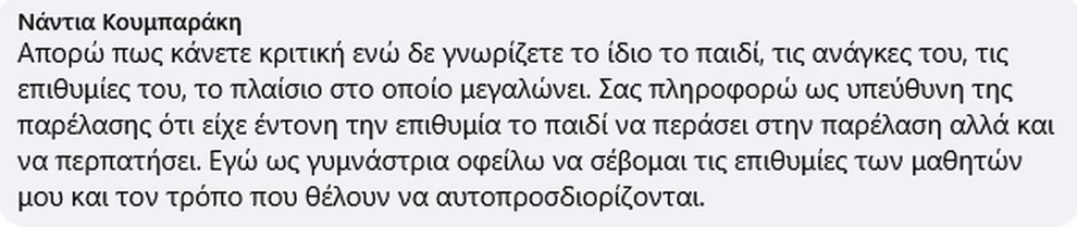 «Απορώ πώς κάνετε κριτική ενώ δεν γνωρίζετε το ίδιο το παιδί, τις ανάγκες του, τις επιθυμίες του, το πλαίσιο στο οποίο μεγαλώνει. Σας πληροφορώ ως υπεύθυνη της παρέλασης ότι είχε έντονη επιθυμία το παιδί να περάσει στην παρέλαση αλλά και να περπατήσει. Εγώ ως γυμνάστρια οφείλω να σέβομαι τις επιθυμίες των μαθητών μου και τον τρόπο που θέλουν να αυτοπροσδιορίζονται» έγραψε χαρακτηριστικά η εκπαιδευτικός.