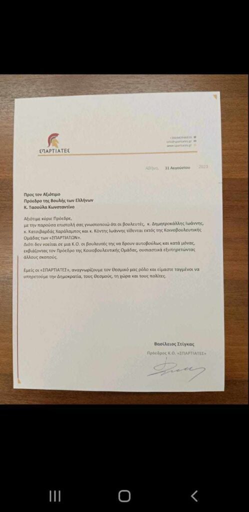 Προηγουμένως ο Βασίλης Στίγκας διέγραψε τρεις βουλευτές από την ΚΟ των Σπαρτιατών. Πρόκειται για τους Κόντη, Δημητροκάλη και Χατζηβαρδά. «Δεν νοείται σε μια ΚΟ οι βουλευτές να δρουν αυτοβούλως και κατά μόνας, εκβιάζοντας τον Πρόεδρο της Κοινοβουλευτικής Ομάδας εξυπηρετώντας άλλου σκοπούς», τονίζεται στην επιστολή που έστειλε στον κ. Τασούλα.