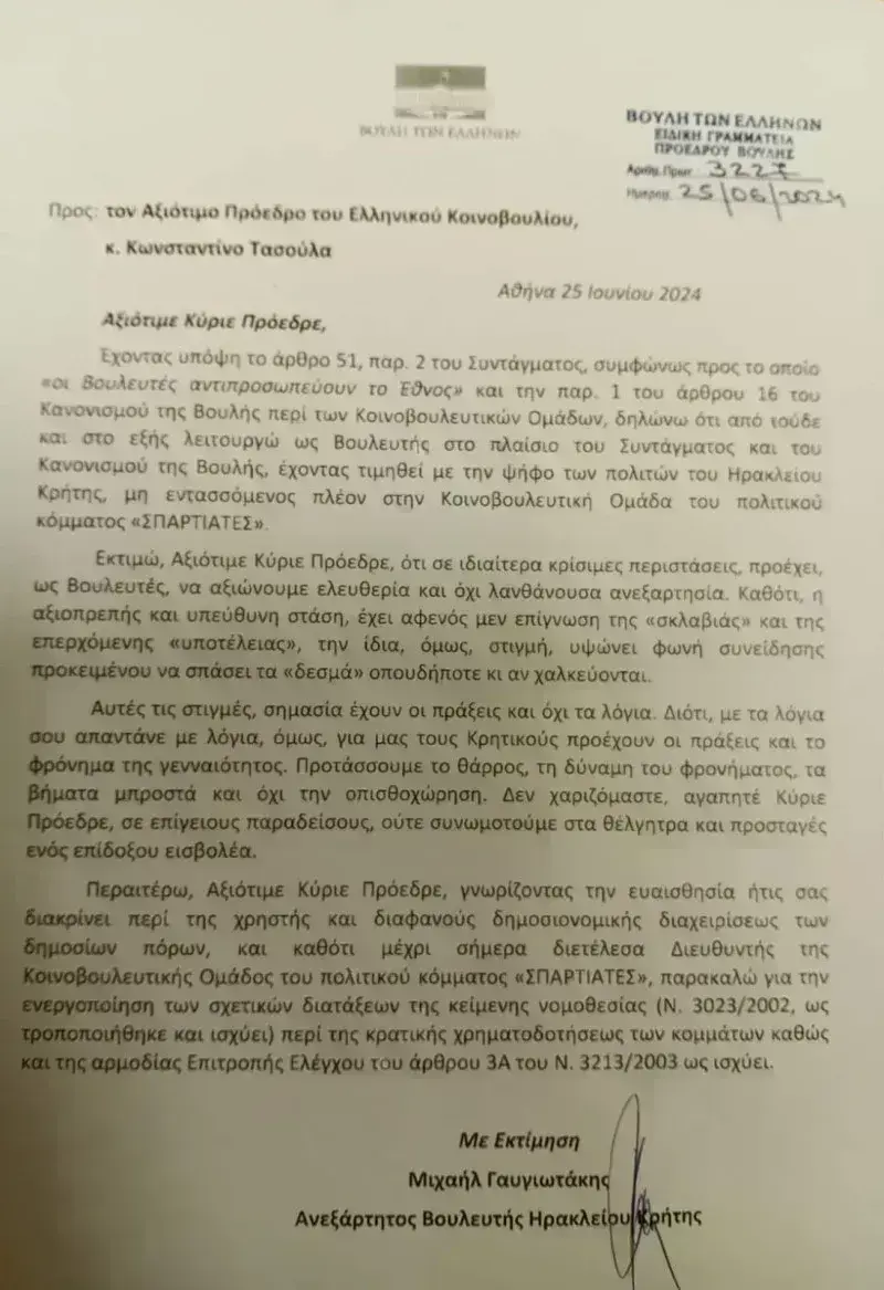 H επιστολή του κ. Γαυγιωτάκη στον πρόεδρο της Βουλής Κωνσταντίνο Τασούλα
