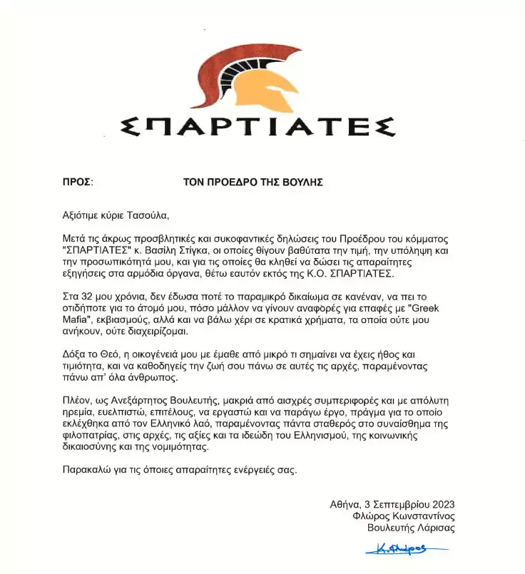 «Μετά τις άκρως προσβλητικές και συκοφαντικές δηλώσεις του Προέδρου του κόμματος “ΣΠΑΡΤΙΑΤΕΣ” κ. Βασίλη Στίγκα, οι οποίες θίγουν βαθύτατα την τιμή, την υπόληψη και την προσωπικότητά μου, και για τις οποίες θα κληθεί να δώσει τις απαραίτητες εξηγήσεις στα αρμόδια όργανα, θέτω εαυτόν εκτός της Κ.Ο. ΣΠΑΡΤΙΑΤΕΣ», τονίζει ο Κωνσταντίνος Φλώρος.