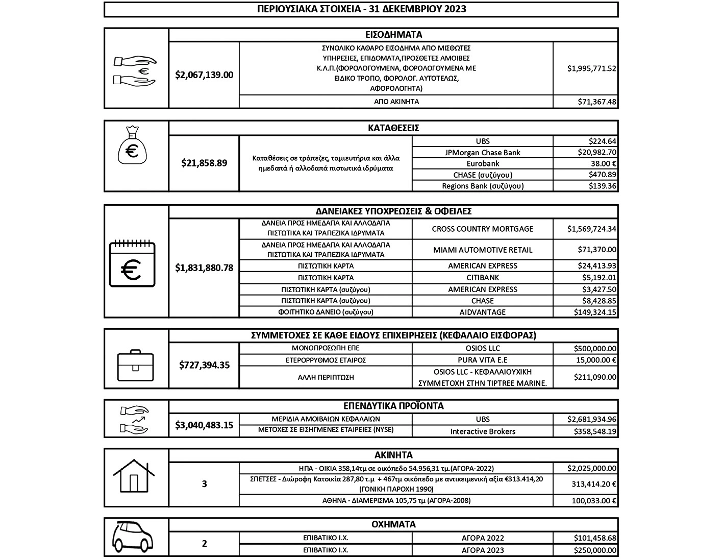 Το «πόθεν έσχες» του παραμένει ένα μυστήριο καθώς παρότι δηλώνει υπέρμαχος της διαφάνειας με κάθε ευκαιρία, παρουσίασε ένα μονοσέλιδο excel που άφησε μια ασάφεια να πλανάται για την περιουσία του και τα εισοδήματά του, όπως άλλωστε και για τις πολιτικές του θέσεις σε κρίσιμα ζητήματα. Το σπίτι με τα κρύσταλλα baccarat στην Εκάλη, όπου πέρασε τα παιδικά του χρόνια, έχει εδώ και καιρό χαθεί. Για την οικονομική καταστροφή της οικογένειάς του, που τον ανάγκασε να μεταναστεύσει, έδειξε ως ένοχο το «παραδικαστικό», ταυτόχρονα με την εμφάνισή του στη δημόσια σφαίρα.