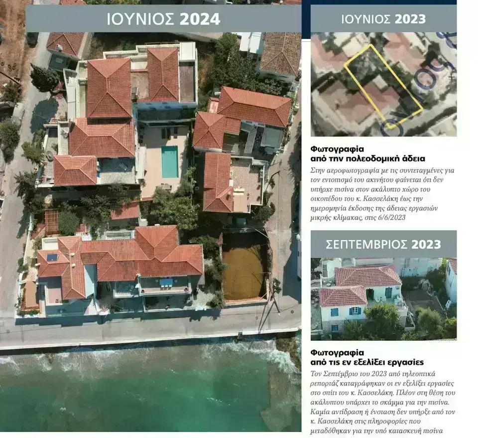 Στο ίδιο έγγραφο της άδειας εργασιών μικρής κλίμακας που φέρνει στη δημοσιότητα η κυριακάτικη εφημερίδα συμπεριλαμβάνεται αεροφωτογραφία με τις συντεταγμένες του ακινήτου του κ. Κασσελάκη (σπίτι και ακάλυπτος χώρος) στην οποία διακρίνεται ότι δεν υπήρχε πισίνα κατά τον χρόνο έκδοσης της άδειας – πέρυσι τον Ιούνιο. Η φωτογραφία από το τηλεοπτικό ρεπορτάζ τον περασμένο Σεπτέμβριο αποδεικνύει την εξέλιξη των εργασιών κατασκευής, ενώ οι φωτογραφίες που ελήφθησαν προ ολίγων ημερών δείχνουν ότι πλέον η πισίνα έχει ολοκληρωθεί και ο περιβάλλον χώρος έχει διαμορφωθεί, αναφέρει το δημοσίευμα.