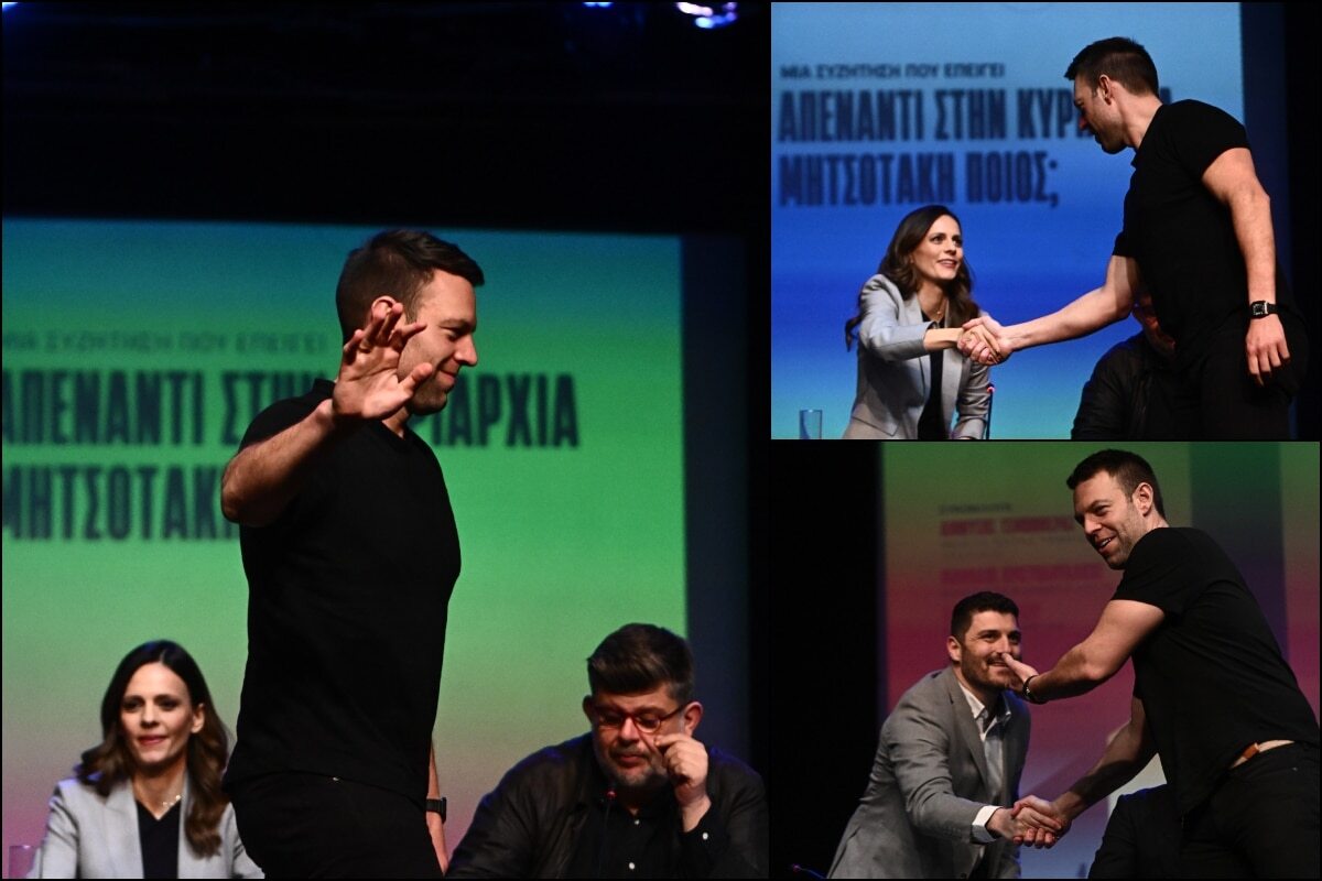 Ο κ. Κασσελάκης που έκανε την έκπληξη εμφανιζόμενος στην εκδήλωση για την Κεντροαριστερά, πριν αποχωρήσει ανέβηκε στη σκηνή και χαιρέτισε έναν έναν τους ομιλητές.