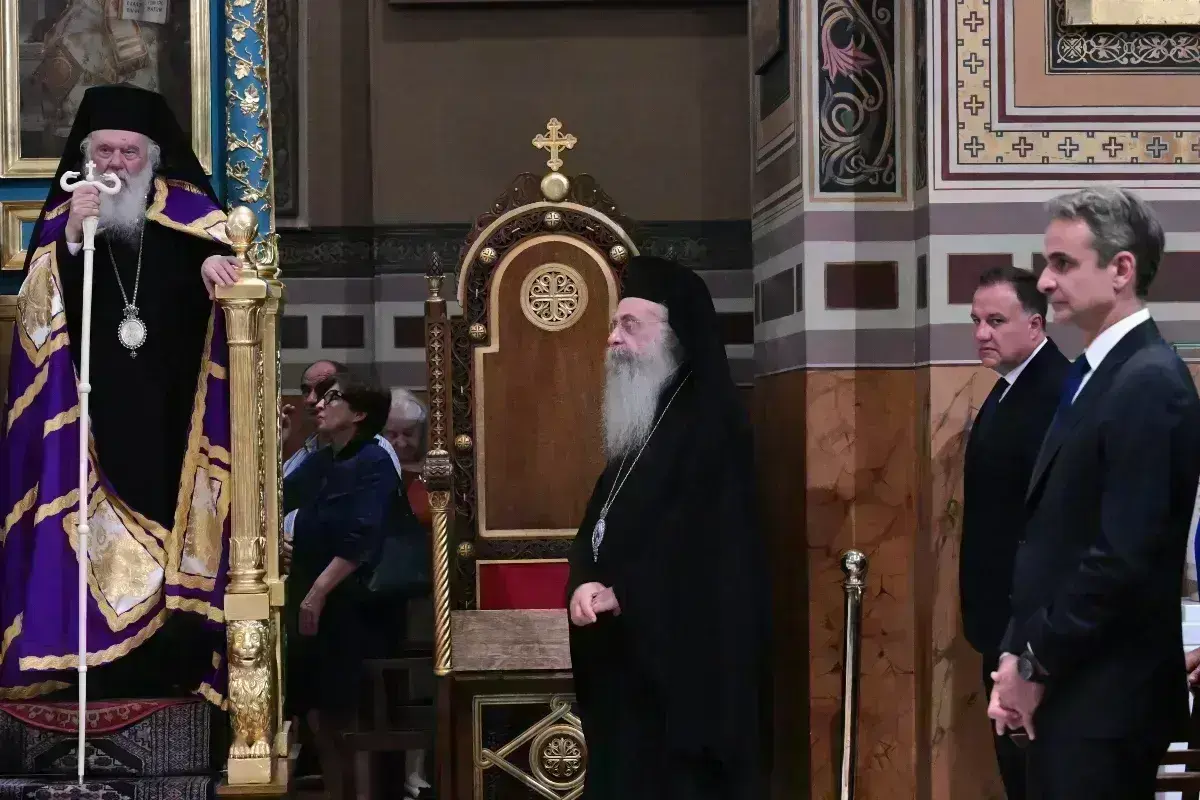 Στη Μητρόπολη Αθηνών παρίσταται και ο πρωθυπουργός Κυριάκος Μητσοτάκης, ο οποίος έφτασε στη Μητρόπολη στις 20:30, όπου χαιρετήθηκε με τον Αρχιεπίσκοπο διά χειραψίας.