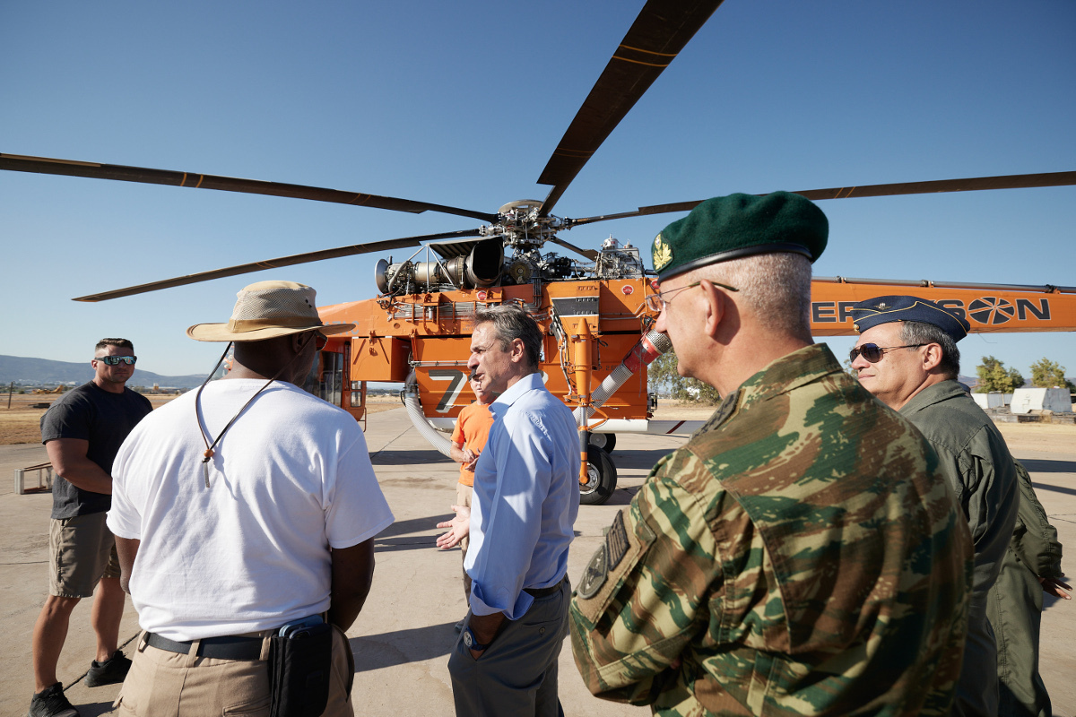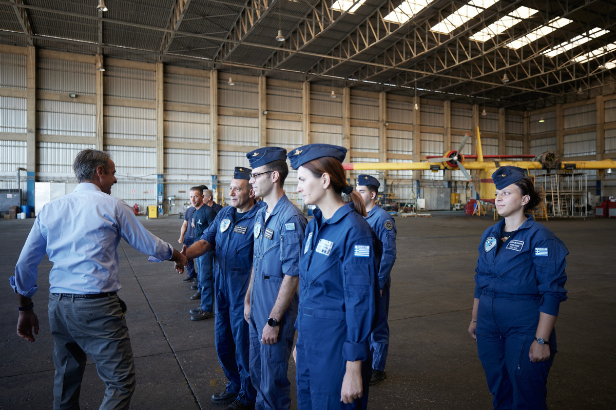 Ο Κυριάκος Μητσοτάκης, συνοδευόμενος από τον Αρχηγό ΓΕΕΘΑ Στρατηγό Δημήτριο Χούπη και τον Αρχηγό ΓΕΑ Αντιπτέραρχο Δημοσθένη Γρηγοριάδη, ενημερώθηκε για τις αποστολές των πυροσβεστικών αεροσκαφών Canadair CL-215 και CL-415 που συμβάλλουν στο απαιτητικό έργο κατάσβεσης των πυρκαγιών, ενώ επισκέφθηκε και τη Μοίρα Συντήρησης Αεροσκαφών, όπου συνομίλησε με τους τεχνικούς που συντηρούν τα αεροσκάφη καθ’ όλη τη διάρκεια του 24ωρου για να ανταποκρίνονται με αποτελεσματικότητα στις αποστολές τους.
