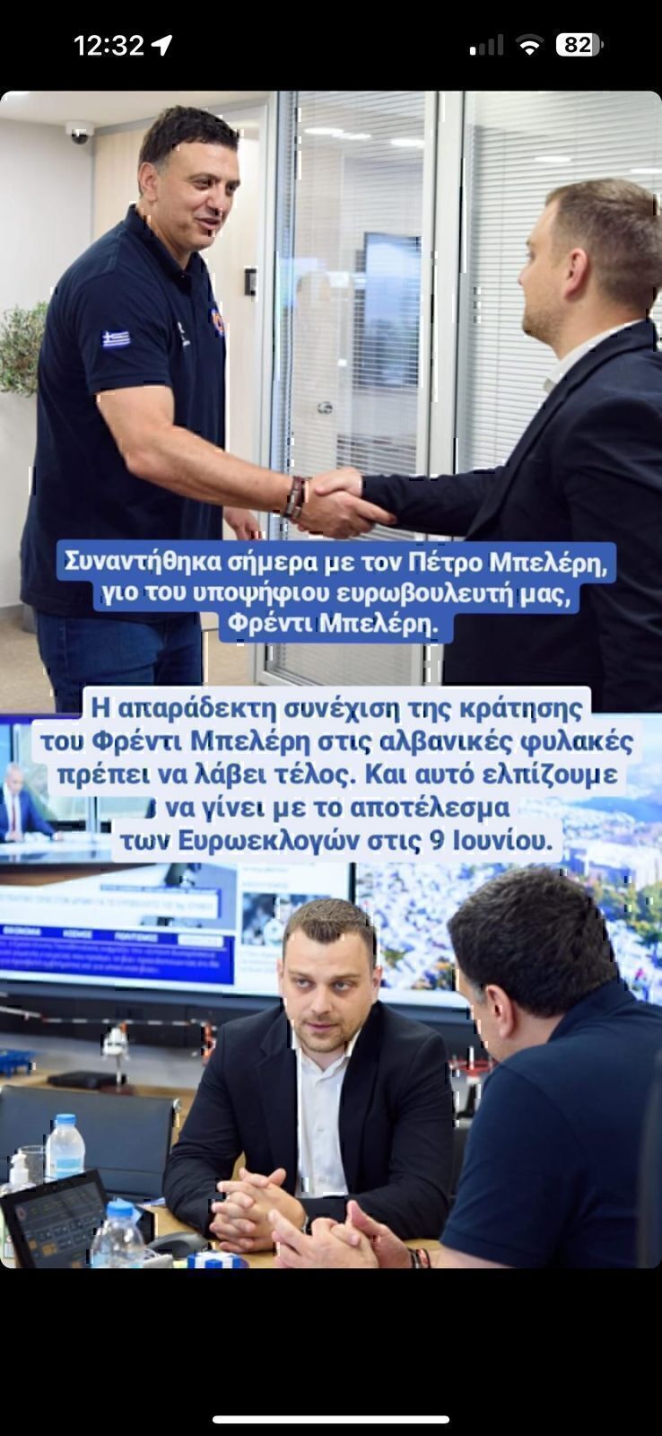 Χθες συναντήθηκε ο Υπουργός Κλιματικής Κρίσης και Πολιτικής Προστασίας Βασίλης Κικίλιας με τον γιο του Φρέντη, Πέτρο, ο οποίος έχει αναλάβει την προεκλογική εκστρατεία του πατέρα του, αφού ο ίδιος βρίσκεται κρατούμενος στις φυλακές Δυρραχίου μετά την εκλογή του στη Δημαρχία της Χειμάρρας. Ο Υπουργός ανήρτησε φωτογραφίες από τη συνάντηση, σημειώνοντας ότι ελπίζει να λάβει τέλος η απαράδεκτη κράτηση του Φρέντι στις φυλακές της Αλβανίας με το αποτέλεσμα των Ευρωεκλογών της 9ης Ιουνίου, ήτοι με την εκλογή του.