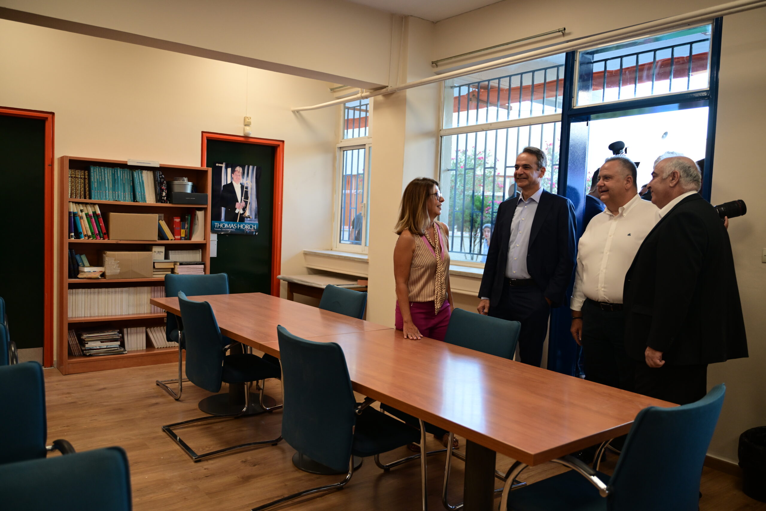 Ο κ. Μητσοτάκης ξεναγήθηκε στους ανακαινισμένους χώρους από τη διευθύντρια του σχολείου.