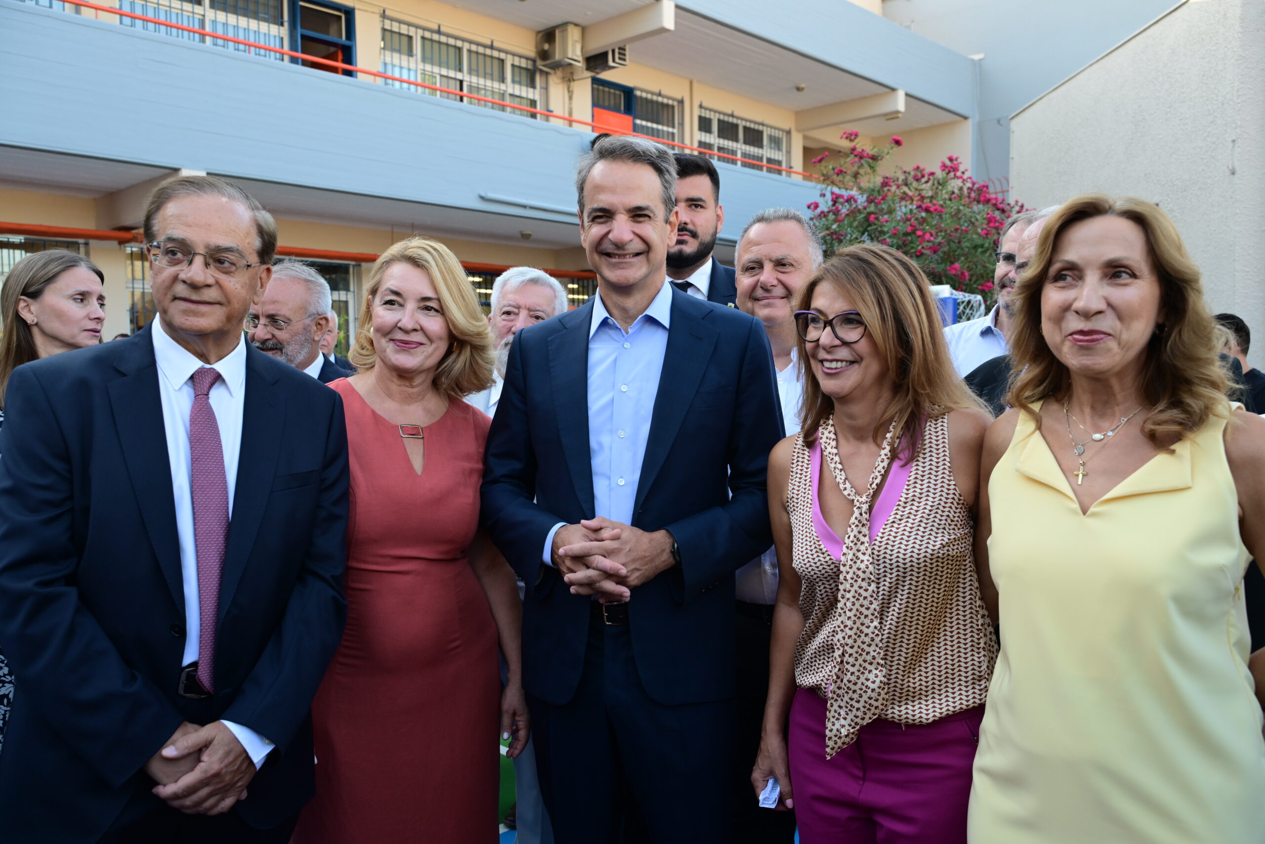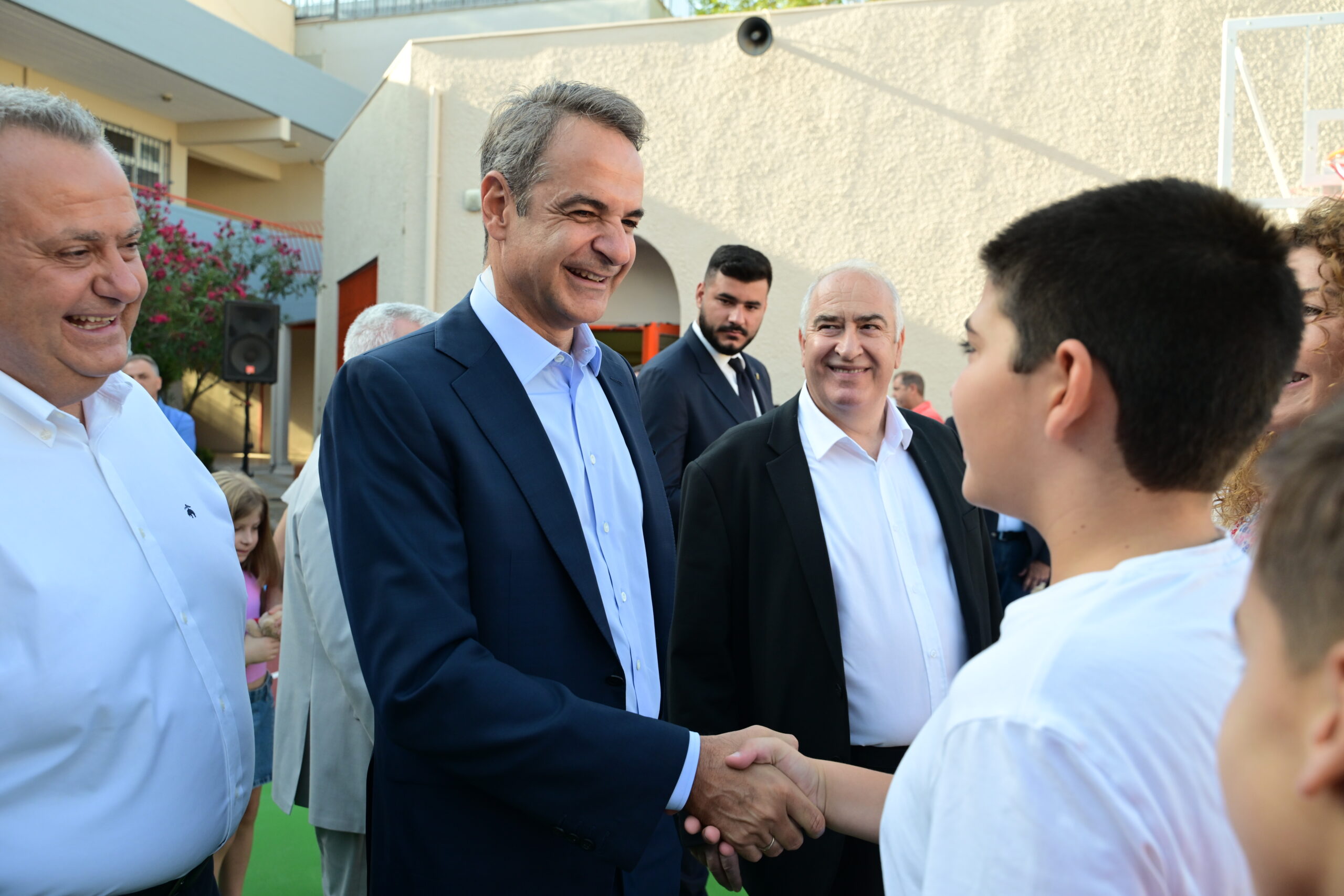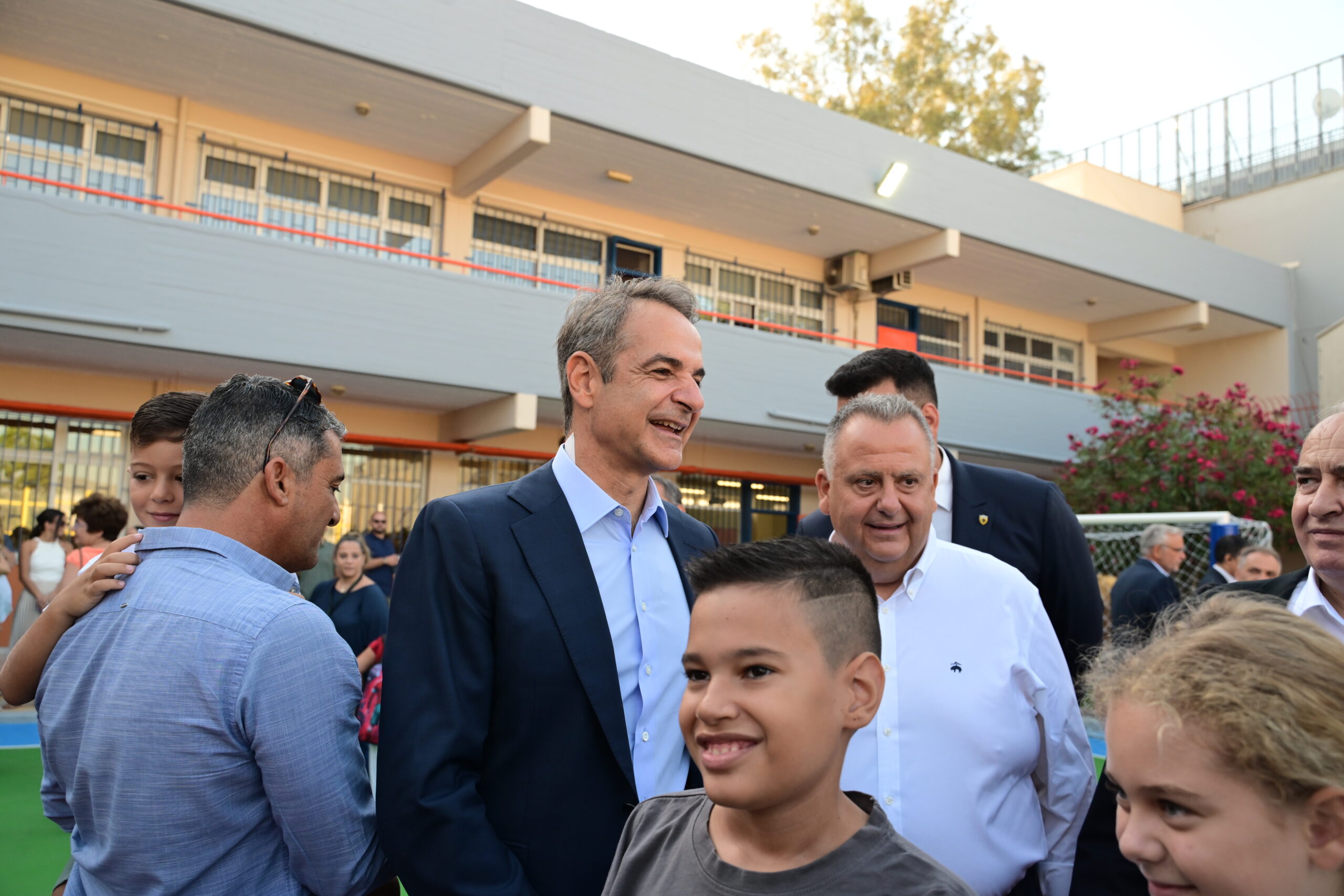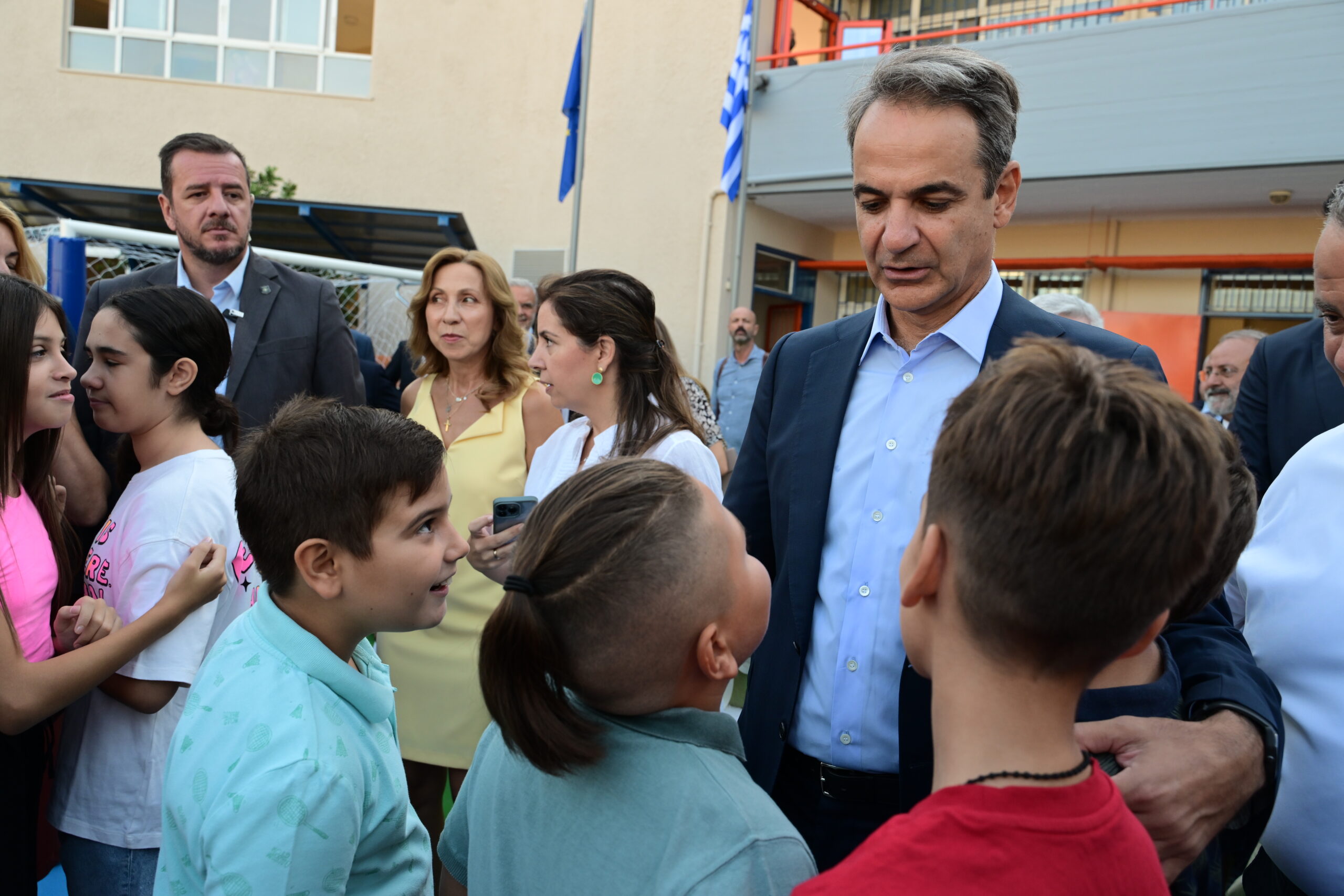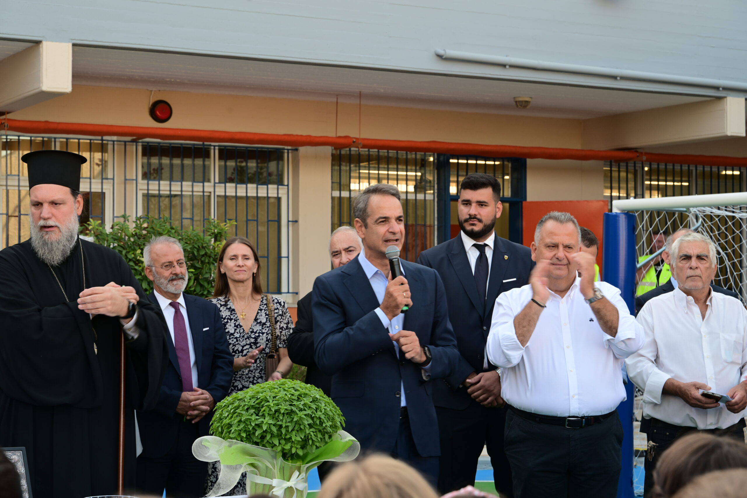 Ο κ. Μητσοτάκης προσέθεσε ότι «σήμερα υποδεχόμαστε τους μαθητές, τους δασκάλους και τους γονείς, σε ένα σχολείο το οποίο έχει πλήρως ανακατασκευαστεί» και απευθυνόμενος στους μαθητές είπε: «Καινούργιες τουαλέτες, καινούργιες τάξεις, καινούργια βαψίματα, μονώσεις, πόρτες, παράθυρα, αλλά και γήπεδα ανακατασκευασμένα έτσι ώστε να περνάτε περισσότερο καιρό παίζοντας μπάσκετ και ποδόσφαιρο και λιγότερο καιρό στα κινητά σας τηλέφωνα. Όπως στο σχολείο το δικό σας, το κουδούνι θα χτυπήσει σε άλλα 430 σχολεία σε όλη την επικράτεια όπου έγιναν αντίστοιχες σημαντικές παρεμβάσεις».