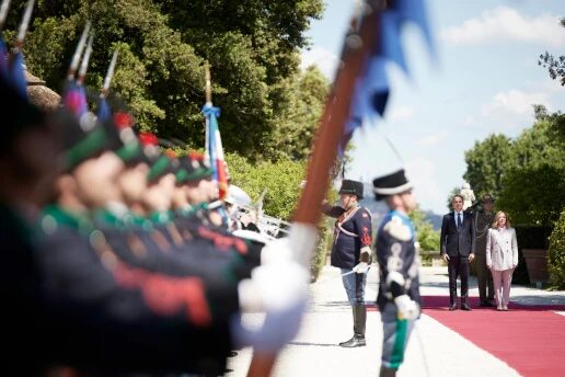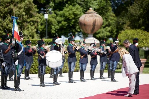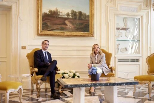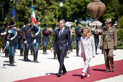 Η υποδοχή του Κυριάκου Μητσοτάκη έγινε υπό τους ήχους του εθνικού ύμνου. Αμέσως μετά, ο πρωθυπουργός με την Ιταλίδα ομόλογό του κατευθύνθηκαν στο εσωτερικό του Παλάτζο Κίτζι.