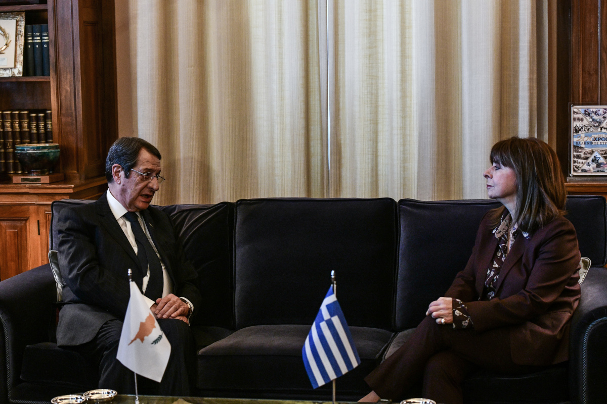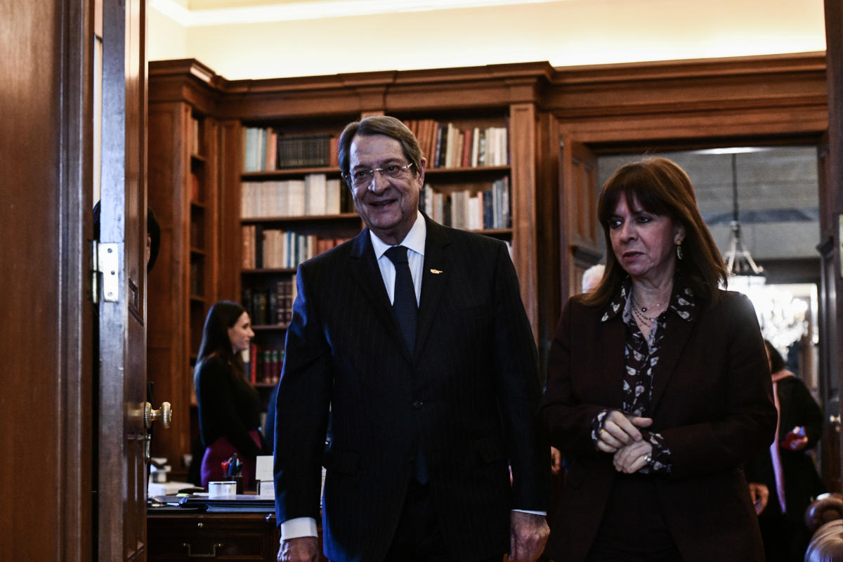 Η Πρόεδρος Κατερίνα Σακελλαροπούλου υποδέχθηκε στην είσοδο του Προεδρικού Μεγάρου τον Πρόεδρο Αναστασιάδη και στη συνέχεια εισήλθαν στο γραφείο της, όπου και πραγματοποιήθηκε η κατ’ ιδίαν συνάντησή τους.