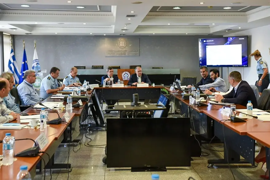 Στη σύσκεψη, που έγινε στην αίθουσα «Παύλος Μπακογιάννης» του υπουργείου, παρόντες ήταν επίσης ο υφυπουργός Προστασίας του Πολίτη, Λευτέρης Οικονόμου, ο αρχηγός της ΕΛΑΣ και ανώτατοι επιτελείς της Αστυνομίας.