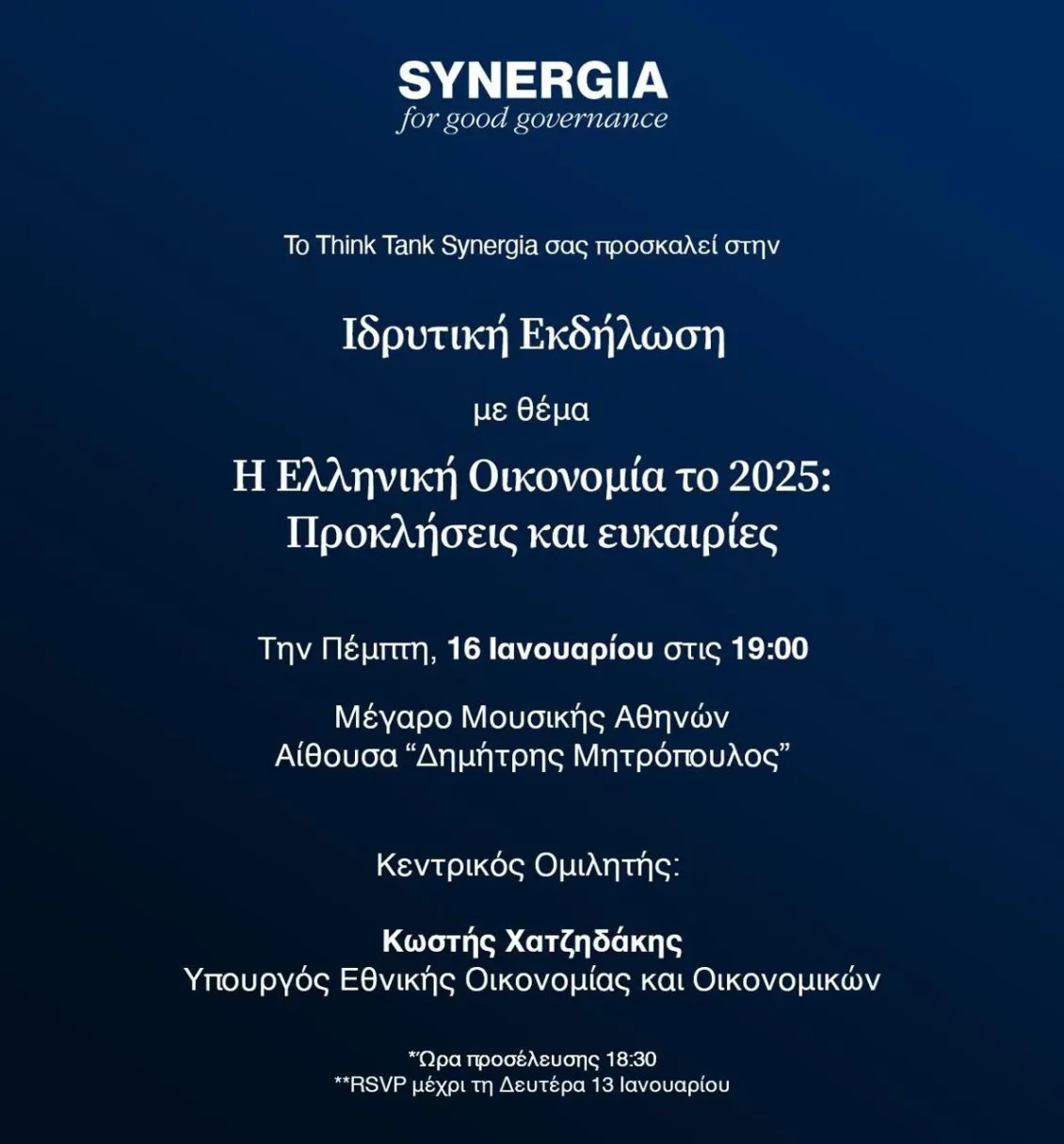 Στις 16 Ιανουαρίου, στο Μέγαρο Μουσικής, θα γίνουν και τα αποκαλυπτήρια σε μια εκδήλωση για την Ελληνική Οικονομία, με ομιλητή τον υπουργό Εθνικής Οικονομίας, Κωστή Χατζηδάκη, ενώ μαθαίνουμε πως θα παρευρεθούν επιχειρηματίες, κορυφαία στελέχη του κυβερνώντος κόμματος και εκπρόσωποι ξένων πρεσβειών.