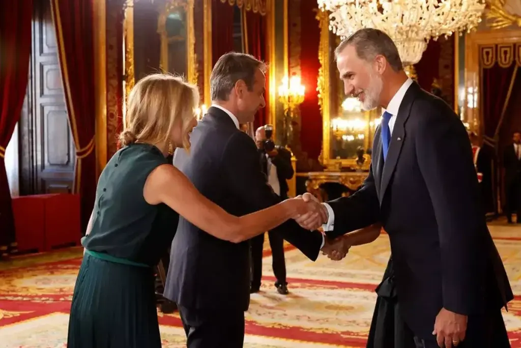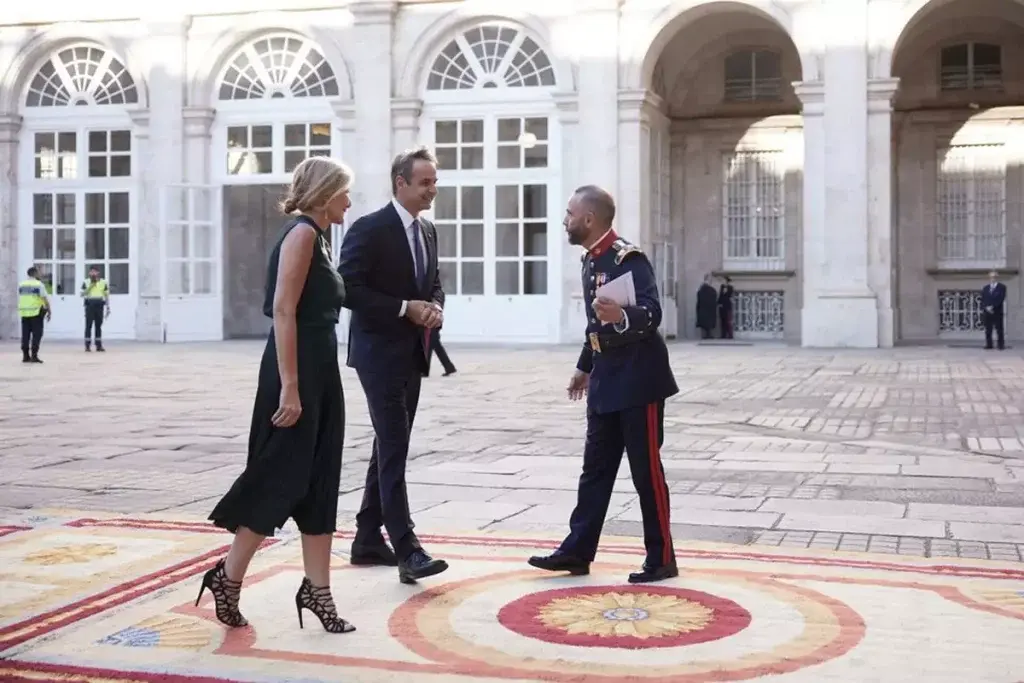 Το παρών στο δείπνο δίνει και ο Έλληνας πρωθυπουργός Κυριάκος Μητσοτάκης που έφτασε στο παλάτι συνοδευόμενος από τη σύζυγό του Μαρέβα Μητσοτάκη -Γκραμπόφσκι, με τον βασιλιά Φίλιππο και τη βασίλισσα Λετίθια να τους υποδέχονται εγκάρδια.