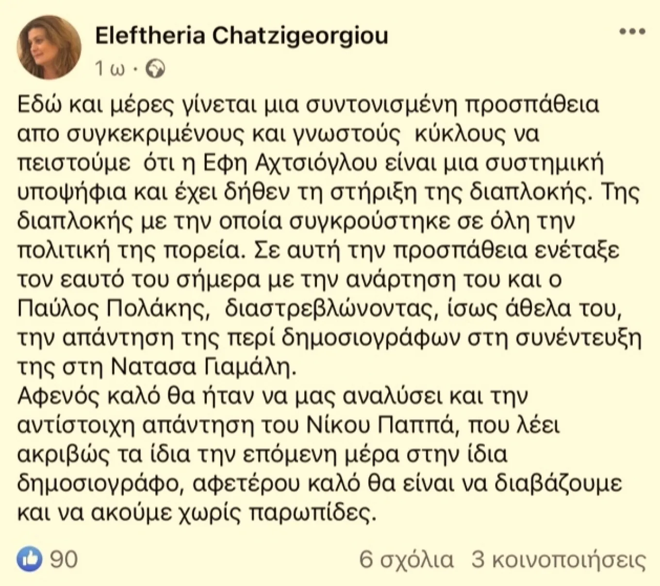 Μολονότι το περιβάλλον της κ. Αχτσιόγλου αρνήθηκε να προβεί σε κάποιο σχόλιο χθες σχετικά με την ανάρτηση του κ. Πολάκη, επισημαίνοντας την οδυνηρή στιγμή για τη χώρα εξαιτίας της απώλειας των δύο πιλότων του πυροσβεστικού αεροσκάφους Canadair, παρόλα αυτά η δημόσια τοποθέτηση του Βουλευτού Χανίων δεν έμεινε εσωκομματικά αναπάντητη. Αντίθετα, με ανάρτησή της στα μέσα κοινωνικής δικτύωσης η πρώην Υφυπουργός Μακεδονίας – Θράκης, Ελευθερία Χατζηγεωργίου, η οποία πρόσκειται στην πλευρά Τζανακόπουλου, κάλεσε τον κ. Πολάκη «να διαβάζουμε και να ακούμε χωρίς παρωπίδες» δίνοντας συνέχεια στη διαδικτυακή κόντρα. «Αφενός καλό θα ήταν να μας αναλύσει και την αντίστοιχη απάντηση του Νίκου Παππά, που λέει ακριβώς τα ίδια την επόμενη μέρα στην ίδια δημοσιογράφο, αφετέρου καλό θα είναι να διαβάζουμε και να ακούμε χωρίς παρωπίδες» απάντησε στον πρώην Υπουργό η κ. Χατζηγεωργίου, με το θερμόμετρο στην Κουμουνδούρου να «χτυπά κόκκινο» και όχι εξαιτίας του καύσωνα.