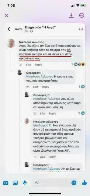 Επ’ ευκαιρία να σας πω ότι έλαβα, καθώς και η οικογένειά μου, απ’ ευθείας απειλή από τον κ. Νικόλαο Αυλιανό γιατί δεν δίνω την έδρα στον πρόεδρο του ΣΥΡΙΖΑ. Το έγραψε επώνυμα και με φωτογραφία στο site της ηλεκτρονικής Αυγής την περασμένη Τρίτη και όταν τον έψαξα στο FB διαφημίζει τις κυνηγετικές του ικανότητες, άρα οπλοφορεί. Θα έπρεπε η Αυγή και ο ΣΥΡΙΖΑ να είναι πιο προσεκτικοί στα όσα δημοσιοποιούν».