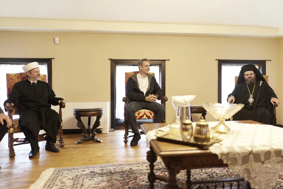 Στο πλαίσιο της επίσκεψής του στην Κομοτηνή, ο Κυριάκος Μητσοτάκης συναντήθηκε με τον Μητροπολίτη Μαρωνείας και Κομοτηνής Παντελεήμων και με τον Τοποτηρητή Μουφτή Κομοτηνής Σερίφ Δαμάδογλου Γιασιάρ, στον Ναό της Κοιμήσεως της Θεοτόκου.