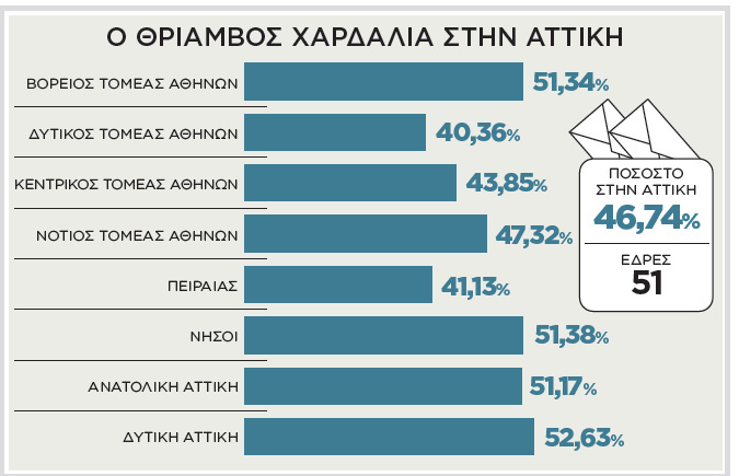 Ειδικότερα, στον Κεντρικό Τομέα της περιφέρειας, ο Νίκος Χαρδαλιάς με το 43,85% που σημείωσε εκτόξευσε τη δύναμη του συνδυασμού κατά 8,42% από το ποσοστό του Γιώργου Πατούλη (35,43%), όπως και από το ποσοστό που είχε καταγράψει στην Α’ Αθήνας τον Ιούνιο η Ν.Δ. (43,27%). Στον Βόρειο Τομέα της Αττικής, ο συνδυασμός του Νίκου Χαρδαλιά έπιασε το 51,43%, από 42,56% του Γιώργου Πατούλη και το 47,32% του Ιουνίου της Ν.Δ.