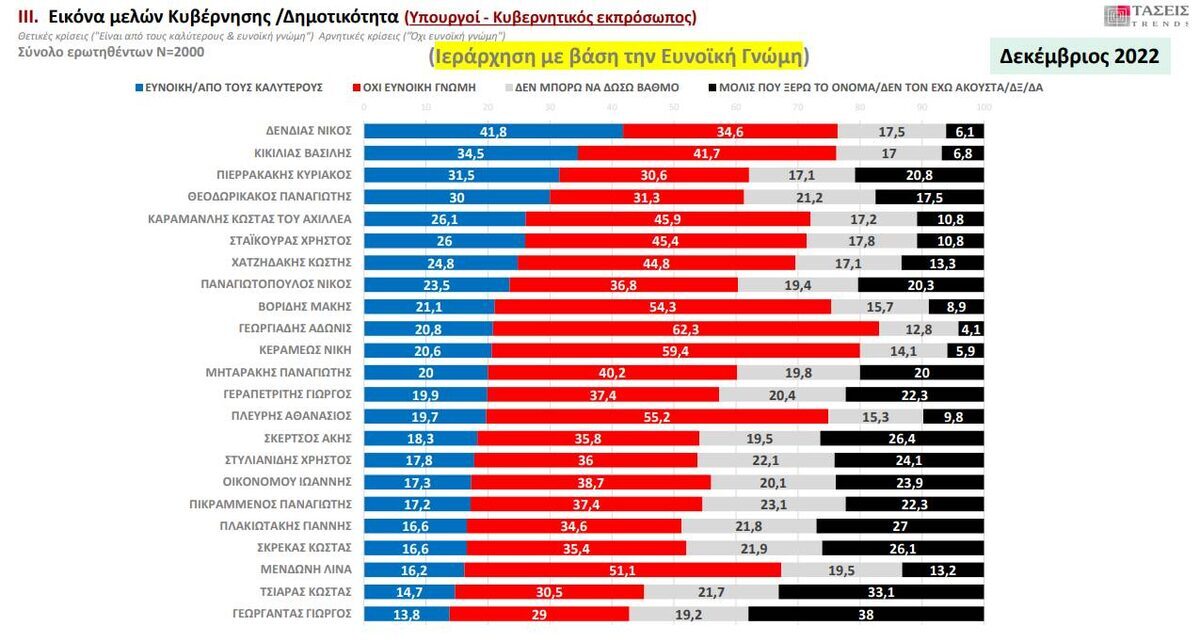 O υπουργός Εξωτερικών Νίκος Δένδιας απολαμβάνει την απόλυτη στήριξη των πολιτών, οι οποίοι τον αναδεικνύουν ως τον δημοφιλέστερο υπουργό. Στη δεύτερη θέση με εντυπωσιακά υψηλά ποσοστά, ο υπουργός Τουρισμού κ. Βασίλης Κικίλιας, με τον ίδιο να βρίσκεται σταθερά στις κορυφαίες θέσεις της συγκεκριμένης μέτρησης από την αρχή της θητείας του.
