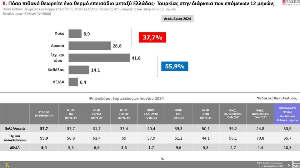 Ανάμεσα στις ερωτήσεις της έρευνας της MRB βρίσκονται και οι ελλητουρκικές σχέσεις με τους ψηφοφόρους να πιστεύουν σε ποσοστό 41,8% όχι και τόσο πιθανό ένα θερμό επεισόδιο μεταξύ Ελλάδας-Τουρκίας στη διάρκεια των επόμενων 12 μηνών.