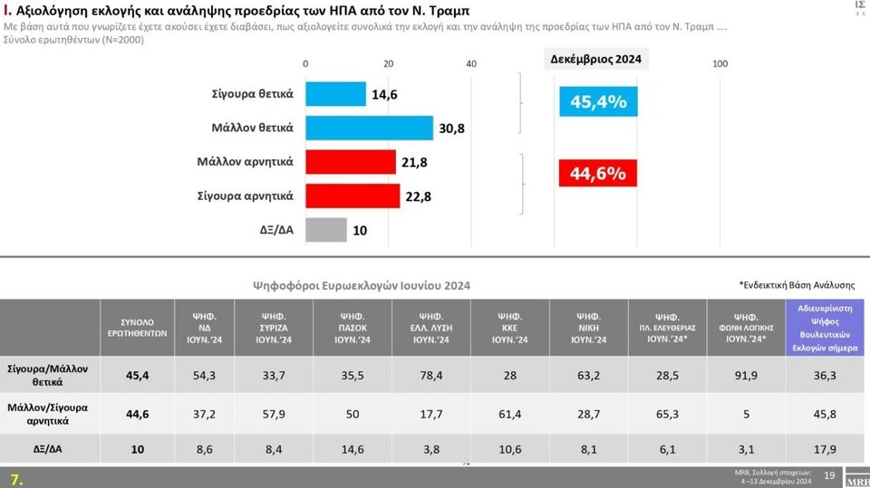 Στο ερώτημα πώς αξιολογείτε συνολικά την εκλογή και ανάληψη της προεδρίας των ΗΠΑ από τον Τραμπ οι πολίτες απαντούν 45,4% «σίγουρα θετικά-μάλλον θετικά» και 44,6% «σίγουρα αρνητικά-μάλλον αρνητικά».