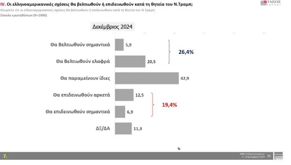 Στο ερώτημα «αν θεωρείτε ότι οι ελληνοαμερικανικές σχέσεις θα βελτιωθούν ή θα επιδεινωθούν κατά τη θητεία του Τραμπ» οι πολίτες απαντούν 42,9% «θα παραμείνουν ίδιες», 26,4% «θα βελτιωθούν σημαντικά-θα βελτιωθούν ελαφρά» και 19,4% θα επιδεινωθούν αρκετά-θα επιδεινωθούν σημαντικά.