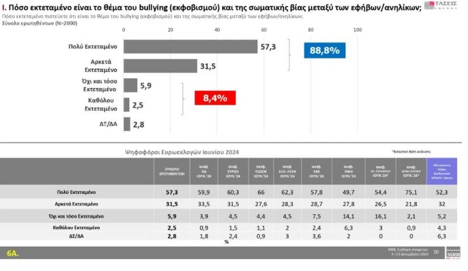 Στο ερώτημα «πόσο εκτεταμένο είναι το θέμα του bullying και της σωματικής βίας μεταξύ των εφήβων/ανηλίκων» το 88,8% απαντά «πολύ εκτεταμένο-αρκετά εκτεταμένο».