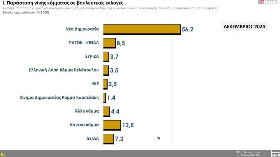 Στην παράσταση νίκης, προηγείται με 56,2% η ΝΔ, ενώ το ΠΑΣΟΚ-ΚΙΝΑΛ συγκεντρώνει ποσοστό 8,5%. Ο ΣΥΡΙΖΑ 3,7%, η Ελληνική Λύση 3,5%, το ΚΚΕ 2,5%, το Κίνημα Δημοκρατίας 1,4%.