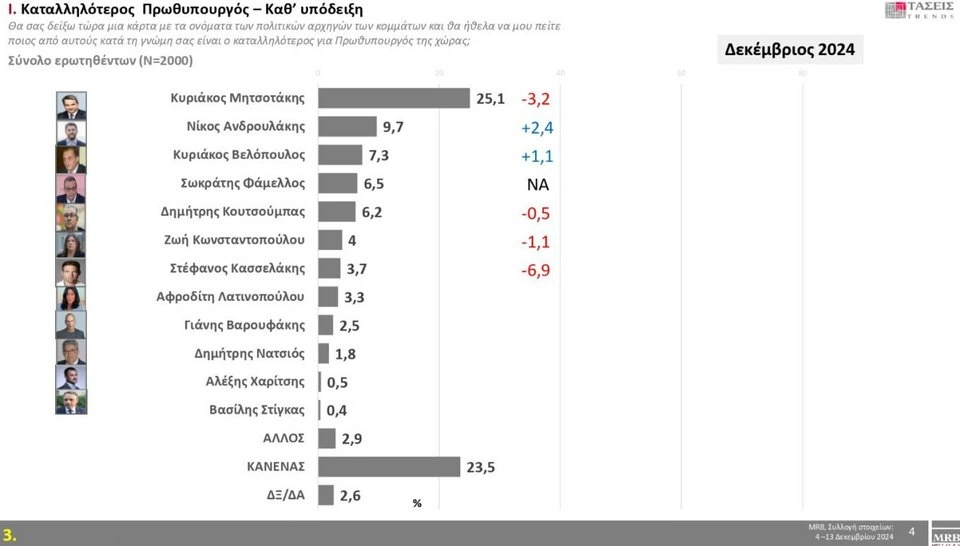 Ο Κυριάκος Μητσοτάκης παραμένει σταθερά καταλληλότερος πρωθυπουργός από τους πολιτικούς αρχηγούς με 25,1%, ακολουθεί ο «κανένας» με 23,5% και τρίτος είναι ο Νίκος Ανδρουλάκης με 9,7%.