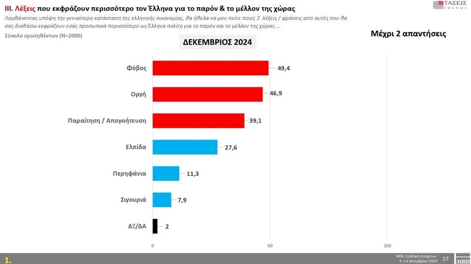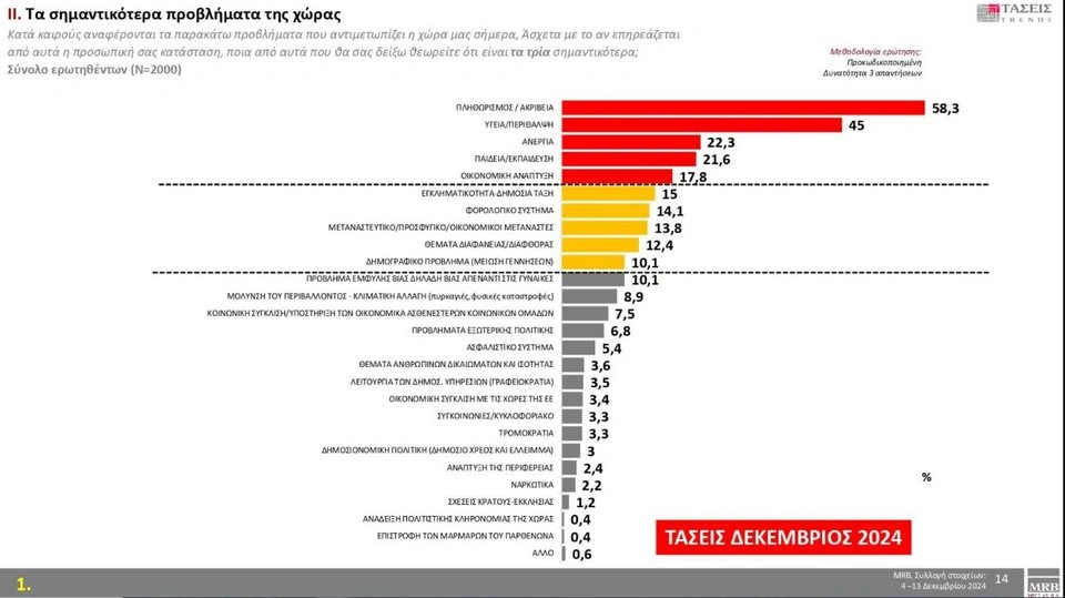 Οι πολίτες θεωρούν ότι τα τρία σημαντικότερα προβλήματα της χώρας είναι: πληθωρισμός/ακρίβεια με 58,3%, υγεία/περίθαλψη με 45% και ανεργία με 22,3%. Η λέξη «φόβος» με ποσοστό 49,4% εκφράζει περισσότερο τους πολίτες για το παρόν και το μέλλον της χώρας, ακολουθούν η «οργή» με 46,9% και η «παραίτηση/απογοήτευση» με 39,1 %.