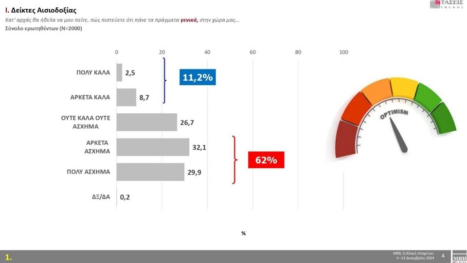 Σε ό,τι αφορά τους δείκτες αισιοδοξίας και συγκεκριμένα στο ερώτημα «πώς πιστεύετε ότι πάνε τα πράγματα γενικά στη χώρα μας», το 62% απαντά «Πολύ άσχημα-Αρκετά άσχημα», ενώ το 11,2% απαντά «Πολύ καλά-Αρκετά καλά».