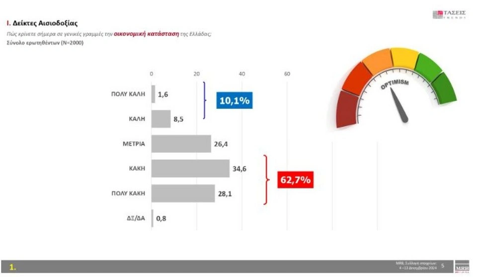 Στο ερώτημα «πώς κρίνετε σε γενικές γραμμές την οικονομική κατάσταση της Ελλάδας», το 62,7% απαντά «Πολύ κακή-κακή» και το 10,1% απαντά «Πολύ καλή-καλή».