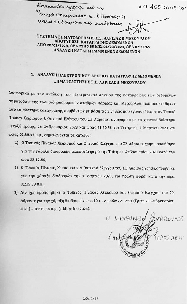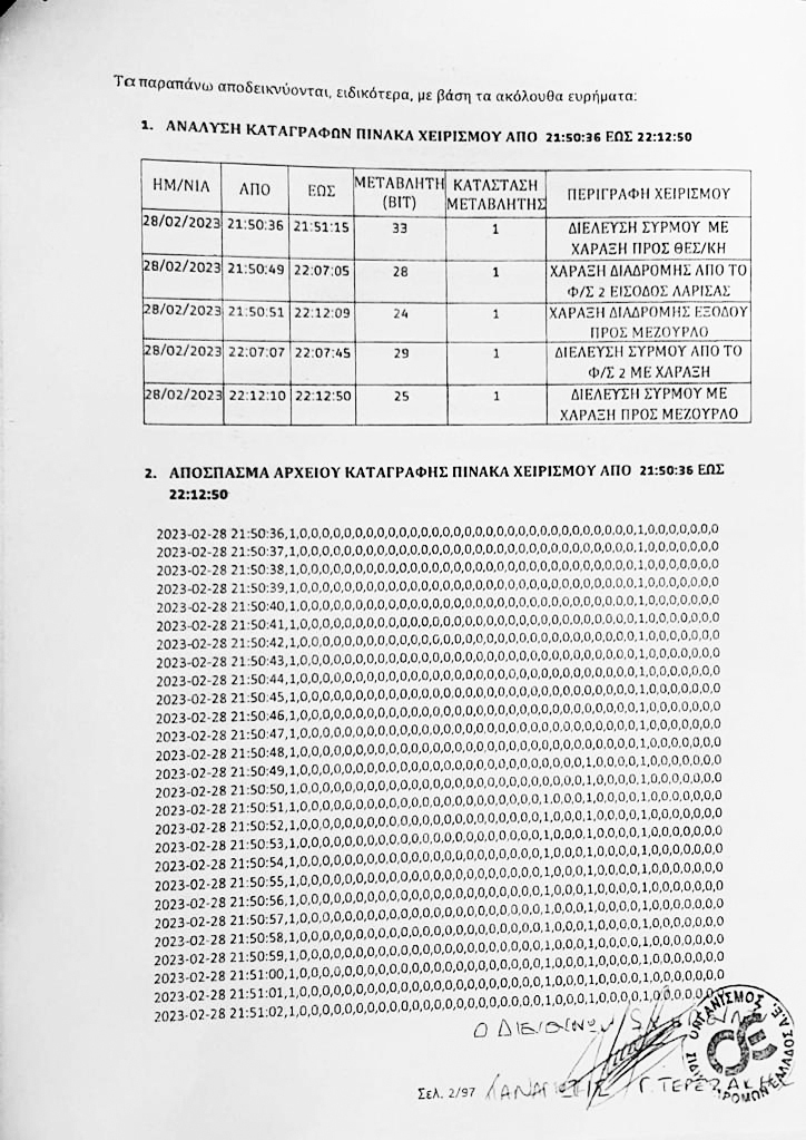 Εδωσε στη δημοσιότητα την ανάλυση του ηλεκτρονικού αρχείου καταγραφής σηματοδότησης από το κέντρο της Λάρισας από την οποία προκύπτει ότι μέχρι τις 10:12 μ.μ. συντελέσθηκαν αυτόματα όλες οι προηγούμενες χαράξεις όλων των δρομολογίων και η μόνη δυστυχώς που ο σταθμάρχης έκανε χειροκίνητα ήταν αυτή της αμαξοστοιχίας 62. Συνεπώς, ανέφερε, το κρίσιμο εκείνο βράδυ το τοπικό σύστημα τηλεδιοίκησης λειτουργούσε απολύτως και ο σταθμάρχης όφειλε να είχε προβεί σε αυτόματη χάραξη.