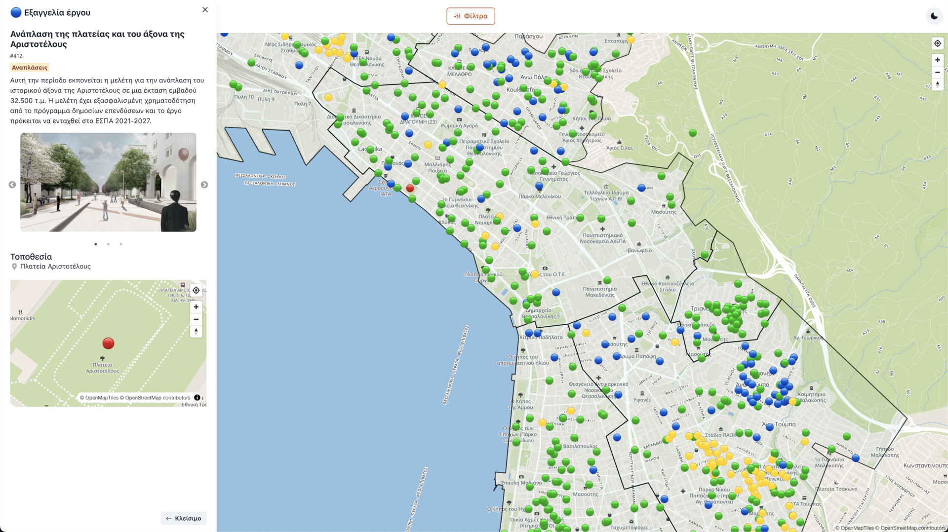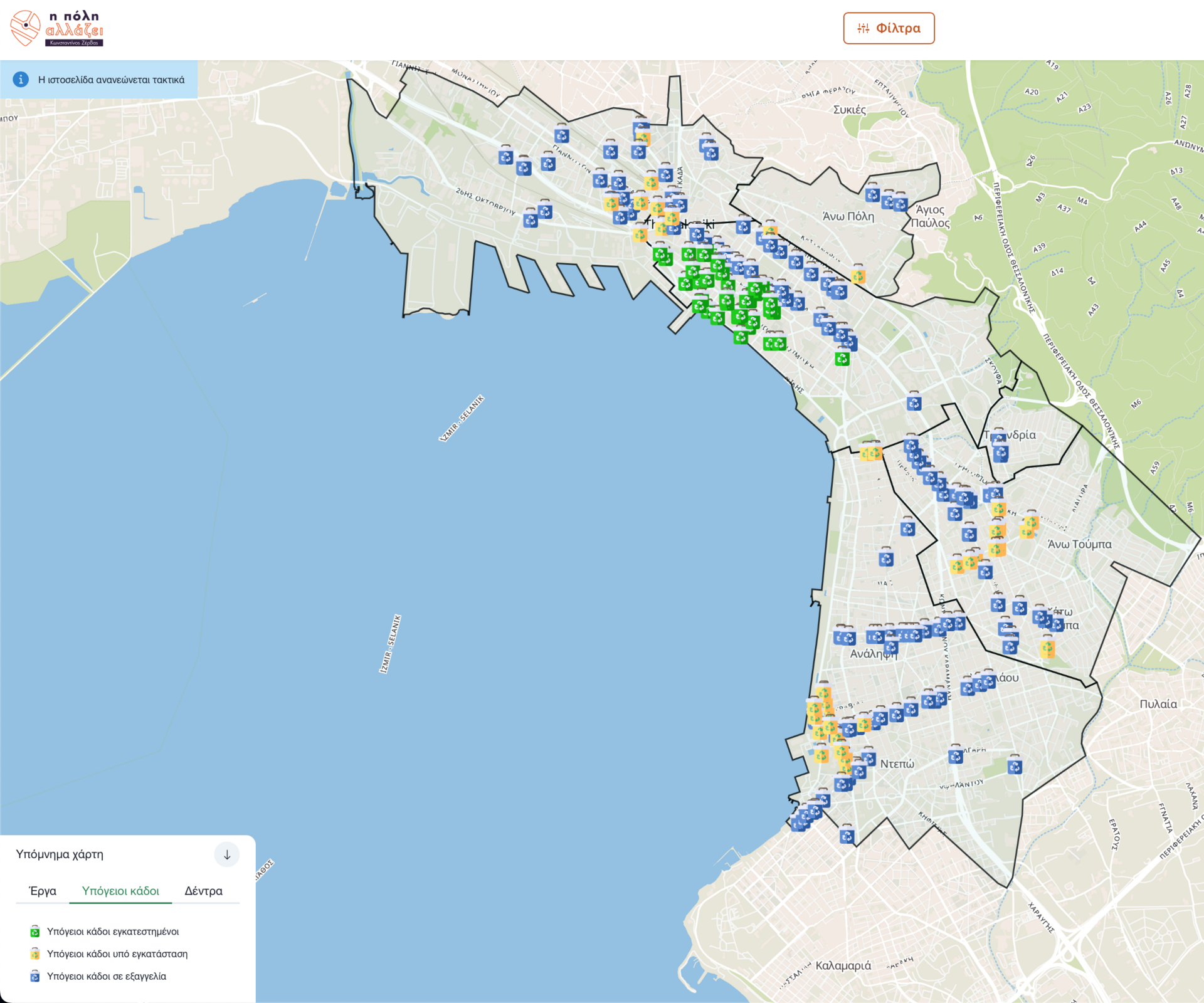 «Σήμερα δεν υπάρχει γειτονιά χωρίς εργοτάξιο, δεν υπάρχει γειτονιά χωρίς φροντίδα. Χωρίς παρεμβάσεις και προγραμματισμό», είναι το μήνυμα του δημάρχου Θεσσαλονίκης που αποτυπώνεται στον διαδραστικό χάρτη, στον οποίο έχουν σημανθεί πάνω από 2.500 σημεία απ’ άκρη σ’ άκρη της πόλης, όπου έχουν υλοποιηθεί ή δρομολογηθεί παρεμβάσεις από τη Διοίκηση του Δήμου Θεσσαλονίκης. Είναι διαθέσιμος στη διεύθυνση thessaloniki2023.gr, περιλαμβάνει σειρά εμβληματικών παρεμβάσεων μέσα από τις οποίες η Θεσσαλονίκη επανασυστήνεται στον κόσμο. Μεταξύ αυτών είναι η ανάπλαση του άξονα της Αριστοτέλους και η επέκταση της παλιάς παραλίας με τη δημιουργία ντεκ, η ανάδειξη των πρώην Στάβλων Παπάφη σε έναν δημιουργικό πολυχώρο με πράσινο, κοινωνικές δομές και δράσεις πολιτισμού και αθλητισμού, η δημιουργία του Μουσείου Ολοκαυτώματος κι ενός μητροπολιτικού πάρκου πέριξ αυτού, η διαμόρφωση του πρώτου Πάρκου για Όλους στην Τούμπα κ.ά.