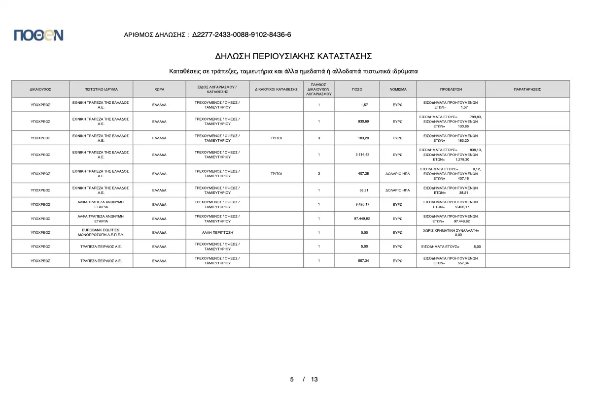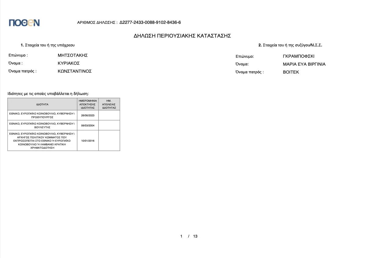 Ακόμη, περιλαμβάνουν τον τραπεζικό τους δανεισμό, την ακίνητη περιουσία και τυχόν συμμετοχές σε εταιρίες η κτήση μετοχών. Αντίστοιχα στοιχεία περιλαμβάνονται και για τους συζύγους.