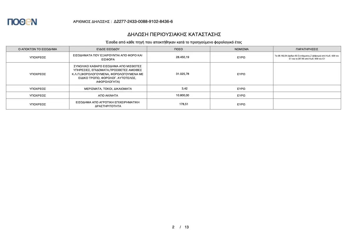 - Εξαιρούμενα από φόρο: 28.450,19 € (εκ των οποίων 28.162,54 € από το Άρθρο 63 του Συντάγματος).