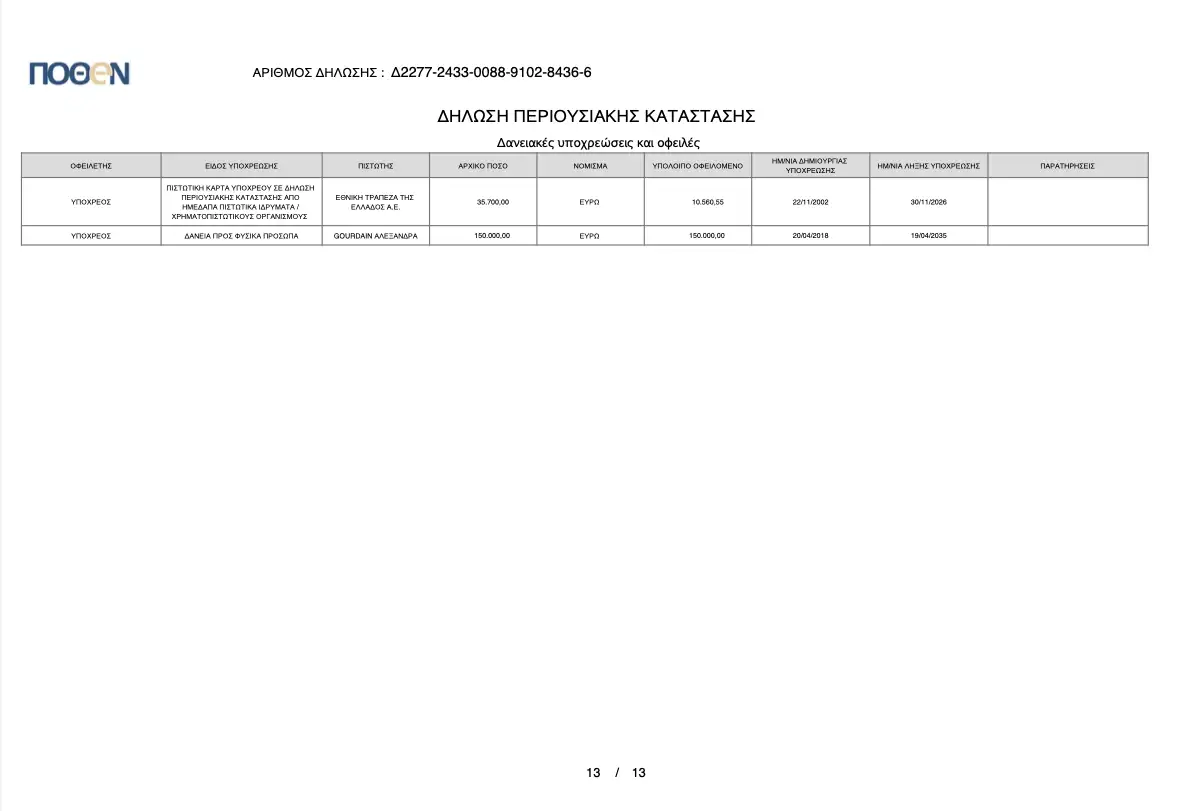 - Υπάρχουν δανειακές υποχρεώσεις, μεταξύ των οποίων πιστωτική κάρτα από την Εθνική Τράπεζα με οφειλόμενο υπόλοιπο 7.496,75 ευρώ (Mastercard).