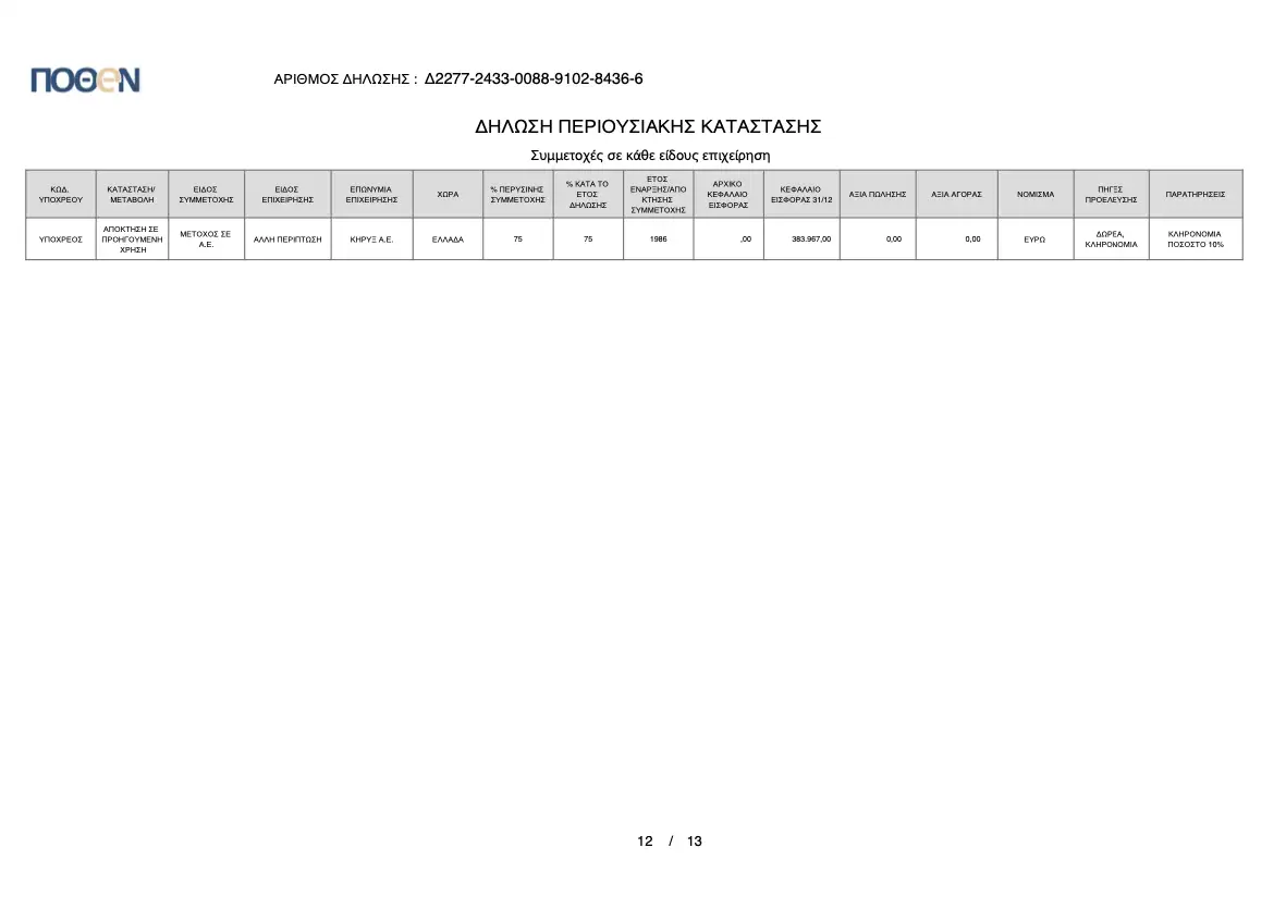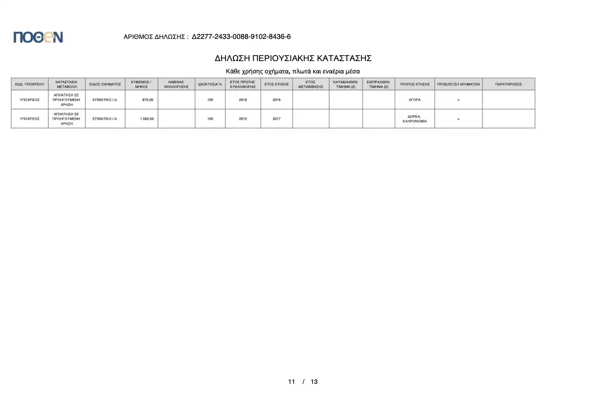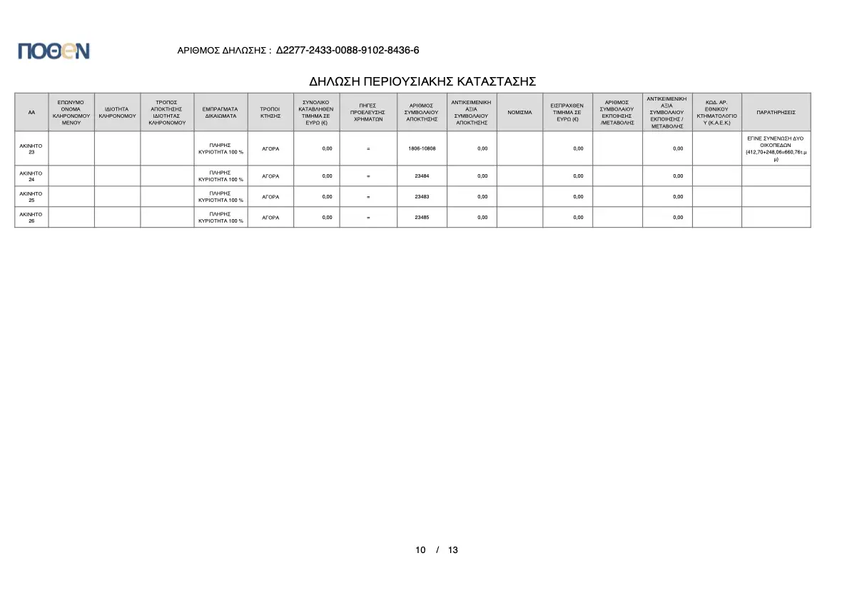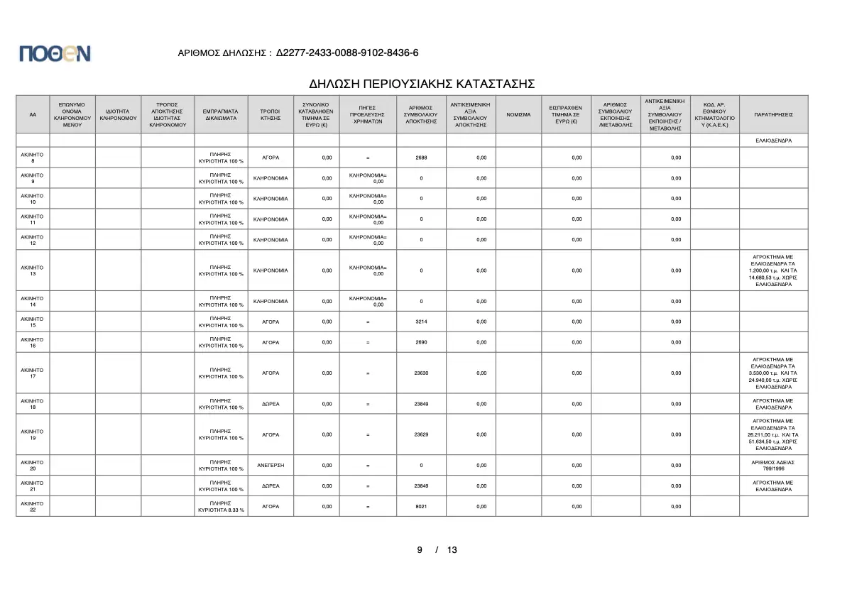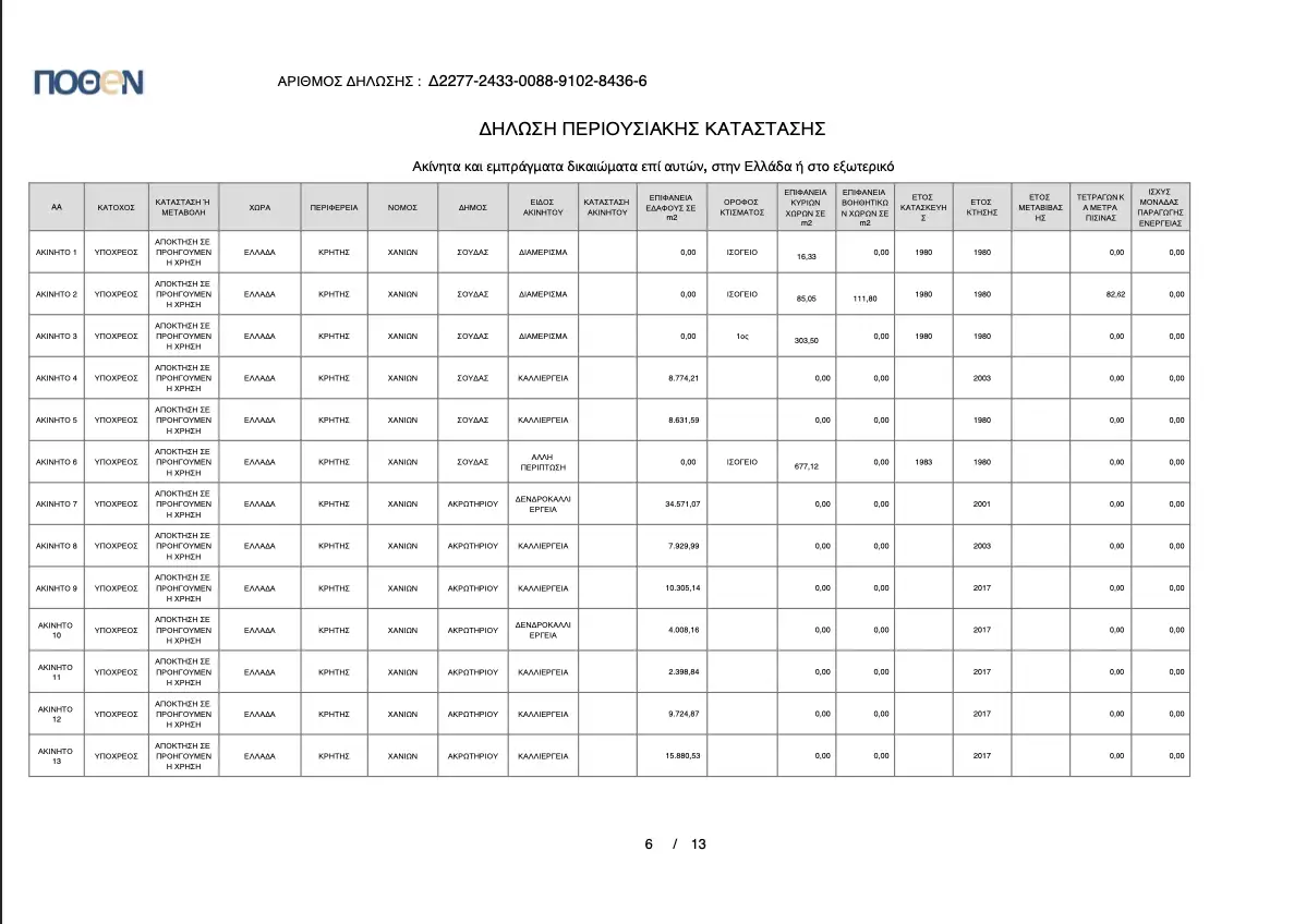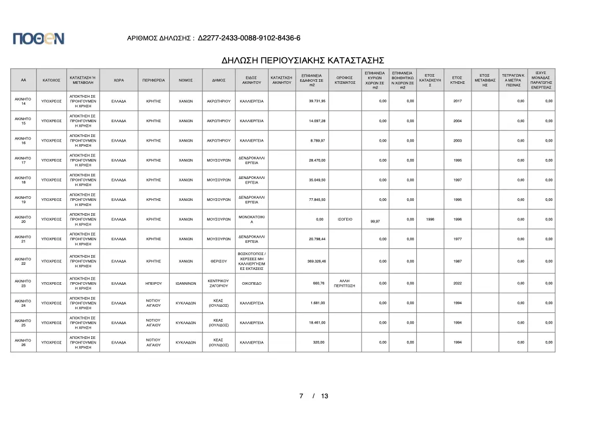 - Αναλυτικές επιφάνειες και έτη κτήσης καταγράφονται στη δήλωση.
