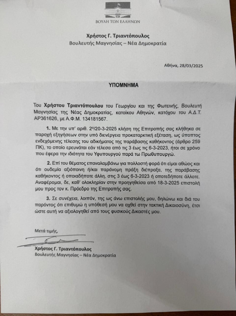 Μεταξύ άλλων ο πρώην υφυπουργός αναφέρει, «επαναλαμβάνω για πολλοστή φορά ότι είμαι αθώος και ότι ουδεμία αξιόποινη ή/και παράνομη πράξη διέπραξα, της παράβασης καθήκοντος ή οποιαδήποτε άλλη, στις 3 έως 6-3-2023 ή οποτεδήποτε άλλοτε. Αναφέρομαι, δε καθ’ ολοκληρίαν στην προηγηθείσα από 18-3-2025 επιστολή μου προς τον κ. Πρόεδρο της Επιτροπής σας. Σε συνέχεια λοιπόν, της ως άνω επιστολής μου, δηλώνω και διά του παρόντος ότι επιθυμώ η υπόθεσή μου να αχθεί στην τακτική Δικαιοσύνη, έτσι ώστε αυτή να αξιολογηθεί από τους φυσικούς Δικαστές μου».