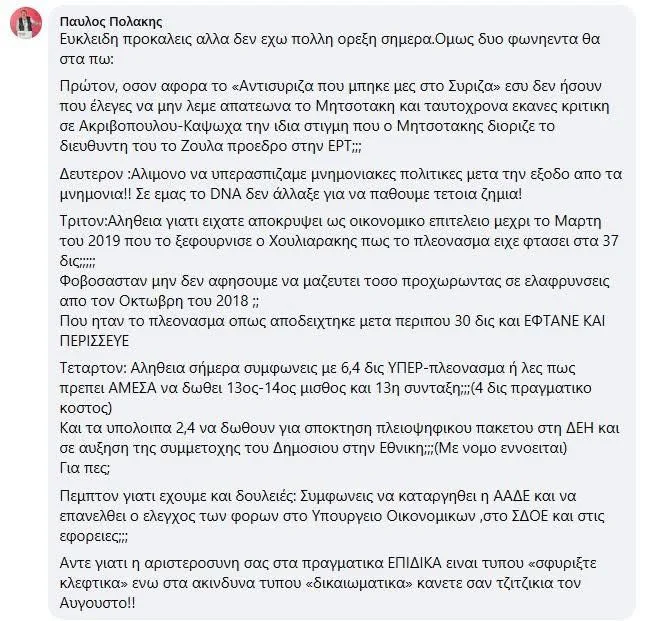 «Ευκλειδη προκαλείς αλλά δεν έχω πολλή όρεξη σήμερα. Όμως δύο φωνήεντα θα στα πω: Πρώτον, όσον αφορά το «Αντισυριζα που μπηκε μες στο Συριζα» εσύ δεν ήσουν που έλεγες να μην λεμε απατεώνα το Μητσοτάκη και ταυτόχρονα έκανες κριτική σε Ακριβοπούλου – Καψώχα την ίδια στιγμή που ο Μητσοτάκης διόριζε το διευθυντή του το Ζούλα πρόεδρο στην ΕΡΤ;;; Δευτερον: Αλίμονο να υπερασπίζαμε μνημονιακές πολιτικές μετά την έξοδο από τα μνημόνια!! Σε εμάς το DNA δεν άλλαξε για να πάθουμε τέτοια ζημιά!
