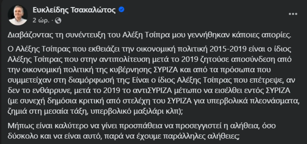 Παράλληλα, υπενθυμίζει ότι, μετά το 2019, ο ίδιος ο Αλέξης Τσίπρας είχε αφήσει χώρο σε μια εσωκομματική δυναμική (Αντι-ΣΥΡΙΖΑ) που ασκούσε συνεχή δημόσια κριτική στην οικονομική στρατηγική της περιόδου διακυβέρνησης ΣΥΡΙΖΑ, με αναφορές σε «υπερβολικά πλεονάσματα», «ζημιά στη μεσαία τάξη» και «υπερβολικό μαξιλάρι». Ο Ευκλείδης Τσακαλώτος καταλήγει τονίζοντας: «Μήπως είναι καλύτερο να γίνει προσπάθεια να προσεγγιστεί η αλήθεια, όσο δύσκολο και να είναι αυτό, παρά να έχουμε παράλληλες αλήθειες;».