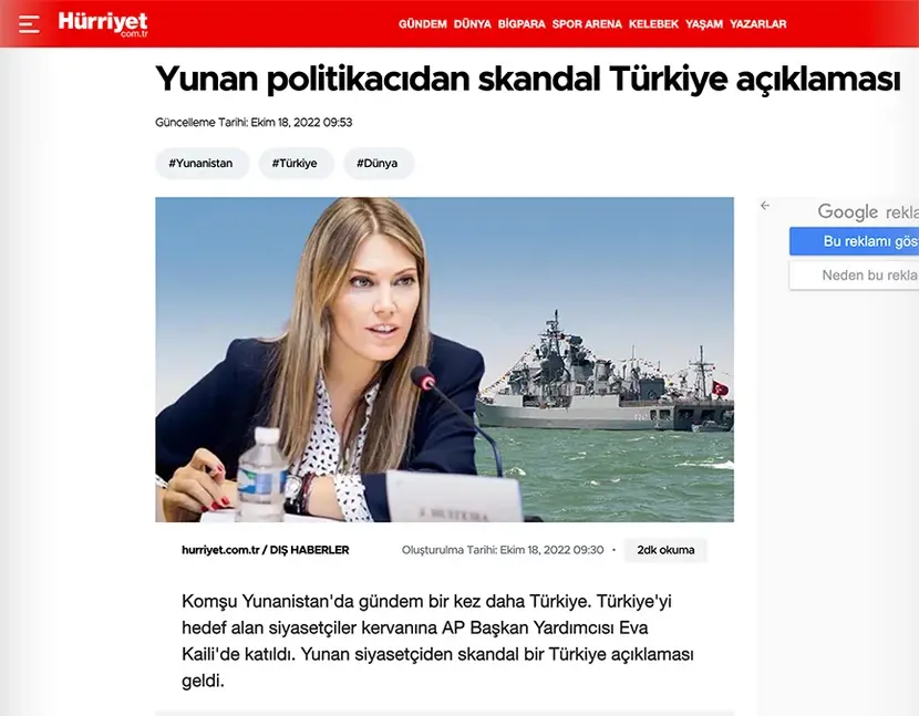 Μάλιστα η Hurriyet φιλοξενεί κείμενο με τίτλο «Σκανδαλώδης δήλωση κατά της Τουρκίας από Έλληνα πολιτικό» και λεζάντα: «Η Τουρκία βρίσκεται για άλλη μια φορά στην ατζέντα της γειτονικής Ελλάδας. Η αντιπρόεδρος του Ευρωπαϊκού Κοινοβουλίου Εύα Καϊλή εντάχθηκε στο καραβάνι των πολιτικών που στοχεύουν την Τουρκία. Μια σκανδαλώδης δήλωση κατά της Τουρκίας από την Ελληνίδα πολιτικό». Στο κείμενο γίνεται λόγος για «χειραγώγηση» των μεταναστών από την πλευρά της Αθήνας, σημειώνοντας ότι «οι Έλληνες πολιτικοί συνεχίζουν να κάνουν αβάσιμους ισχυρισμούς κατά της Τουρκίας, παρά το γεγονός ότι ο υπουργός Εξωτερικών Μεβλούτ Τσαβούσογλου αποκάλυψε πώς η Ελλάδα άλλαξε τις συντεταγμένες ώστε να φαίνεται ότι τα πρόσφατα γεγονότα έγιναν στα τουρκικά χωρικά ύδατα».