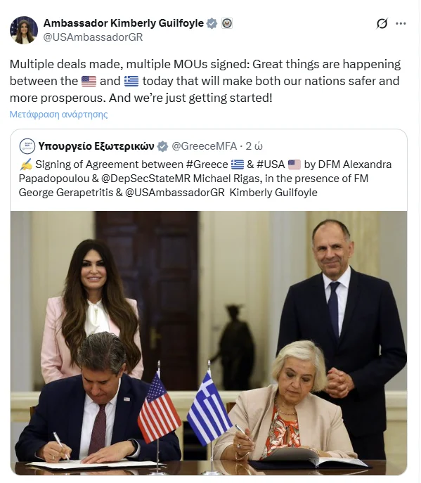 Με μια ανάρτηση, η Κίμπερλι Γκίλφοϊλ χαιρέτισε τις υπογραφές συμφωνιών μεταξύ Ελλάδας και ΗΠΑ. «Πολλαπλές συμφωνίες που έγιναν, πολλά μνημόνια που υπογράφηκαν: Σημαντικά πράγματα συμβαίνουν μεταξύ ΗΠΑ και Ελλάδας σήμερα, που θα κάνουν τα έθνη μας ασφαλέστερα και πιο ευημερούντα. Και μόλις ξεκινάμε!» έγραψε η πρέσβης των ΗΠΑ.