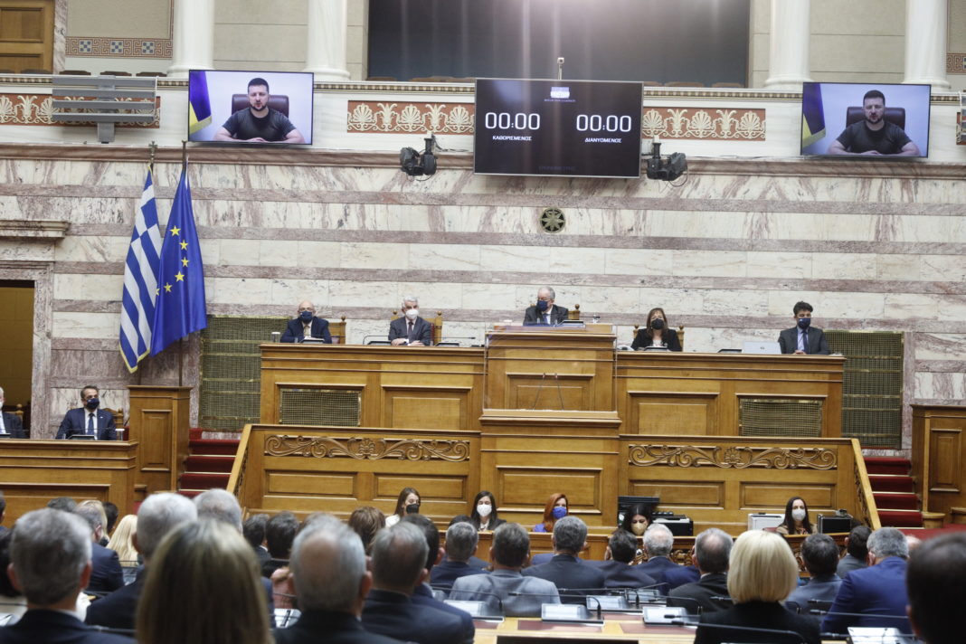 Η Νέα Δημοκρατία, ο ΣΥΡΙΖΑ και το ΚΙΝΑΛ είναι τα κόμματα τα οποία διάκεινται θετικά προς τη φιλοξενία του Ουκρανού προέδρου στη Βουλή. Το ΚΚΕ, η Ελληνική Λύση αντιτίθενται συλλήβδην, ενώ το ΜέΡΑ 25 τηρεί αντιφατική στάση, με ένα εν μέρει «όχι».